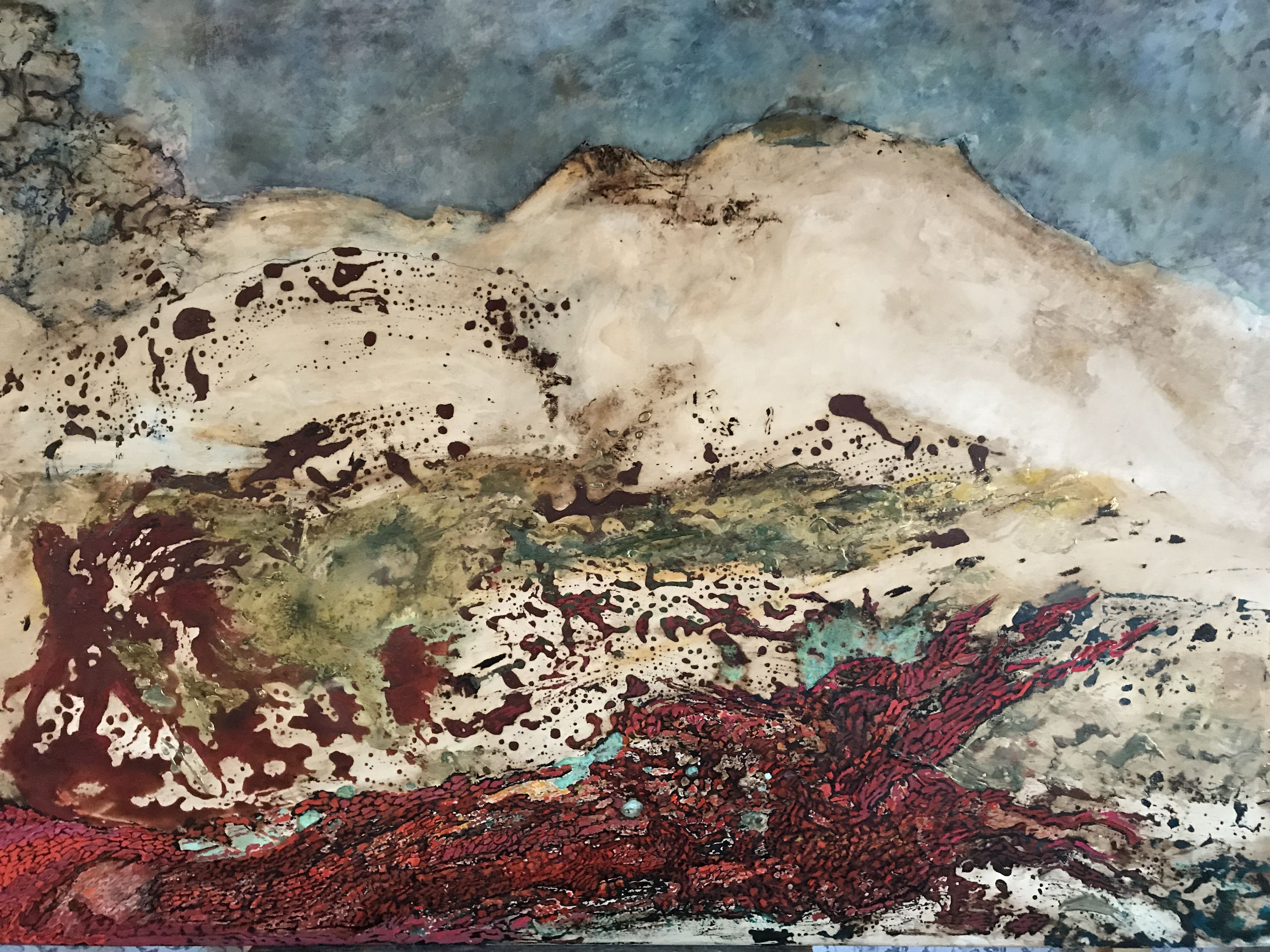 Cuando volví a San Juan después de vivir casi un año en París, tuve necesidad de retomar mi esencia y me zambullí en el mundo de los mitos y leyendas cordilleranas. Recordando parte de la enseñanza de mi niñez. En casi todos los cuadros que pinté en esa época, está presente la cordillera como marco de sostén de los mitos que evocaba en mi pintura. Entonces, tiempo después di por terminada esa etapa y no tuve más que abrir el zoom y apareció la cordillera, que de hecho es el gran marco de sostén identitario de nuestra cultura”.