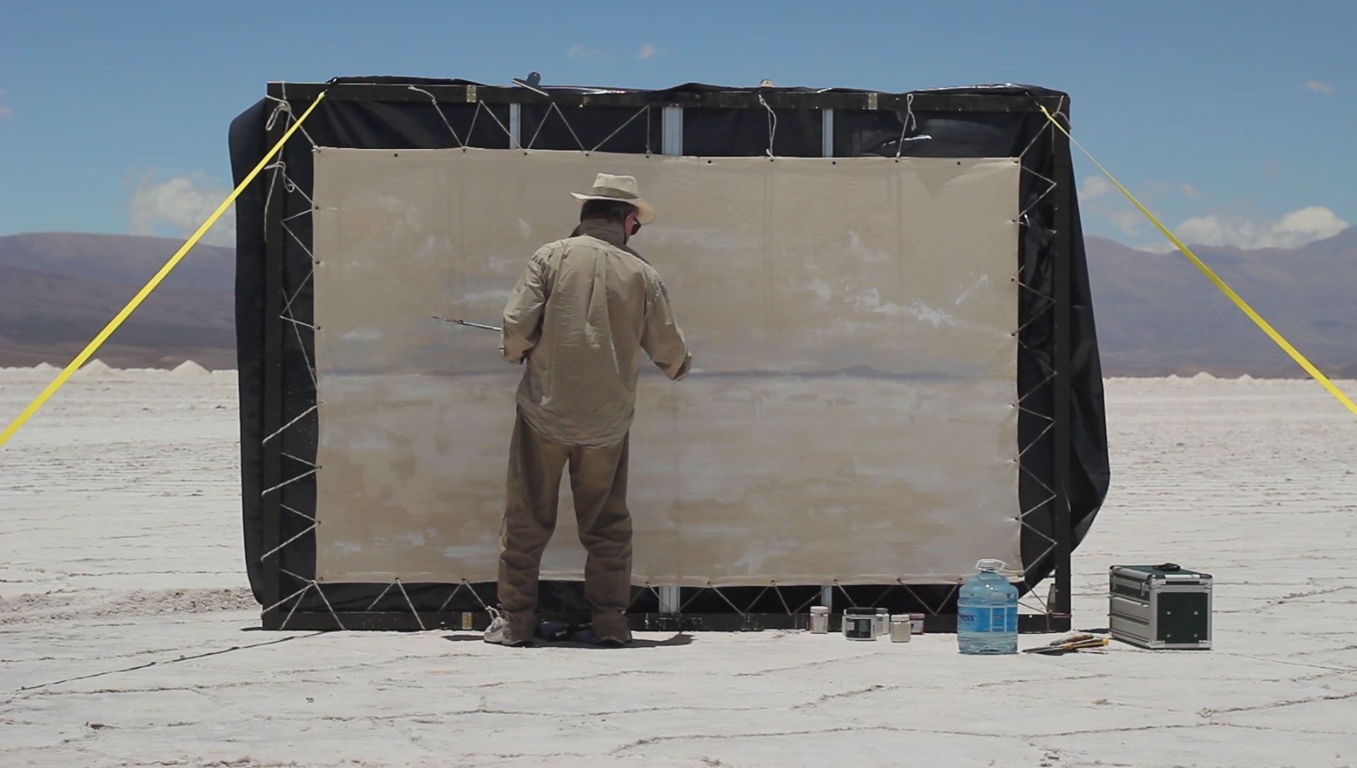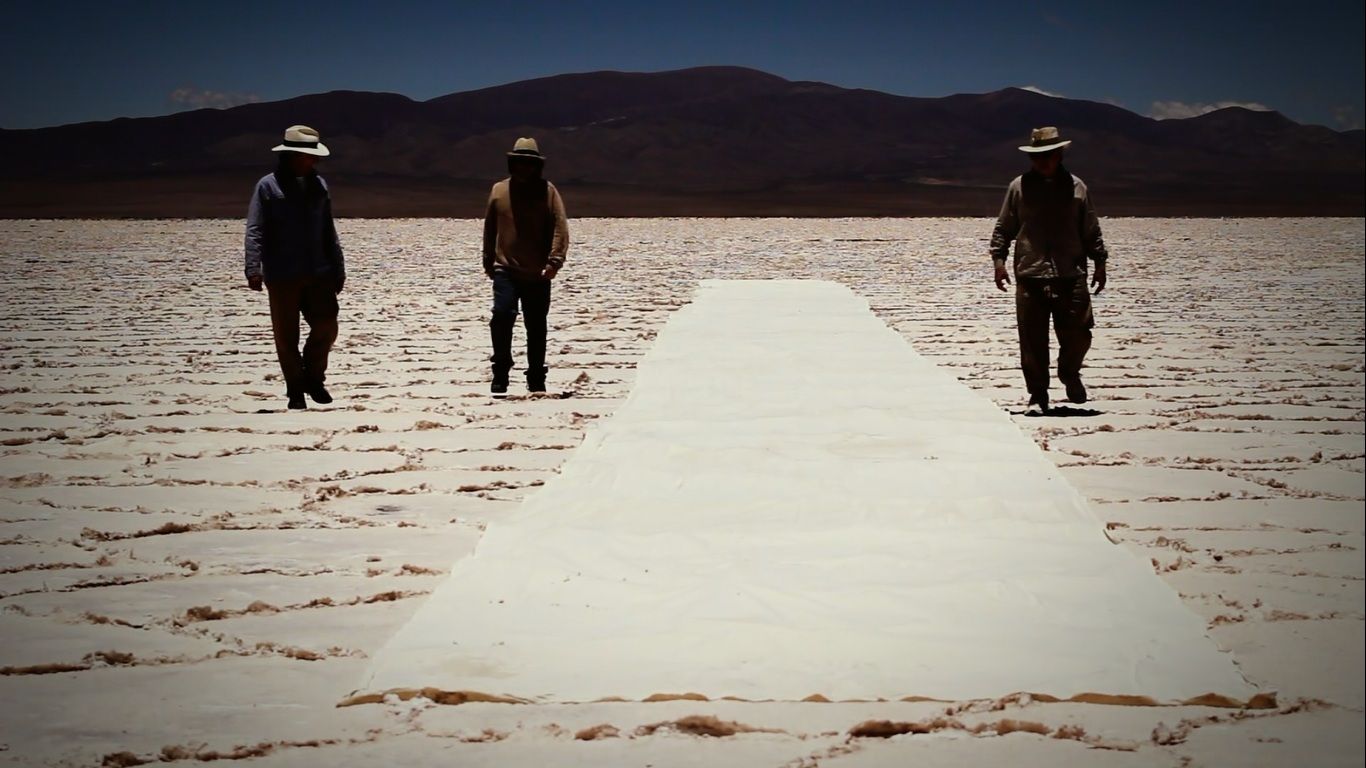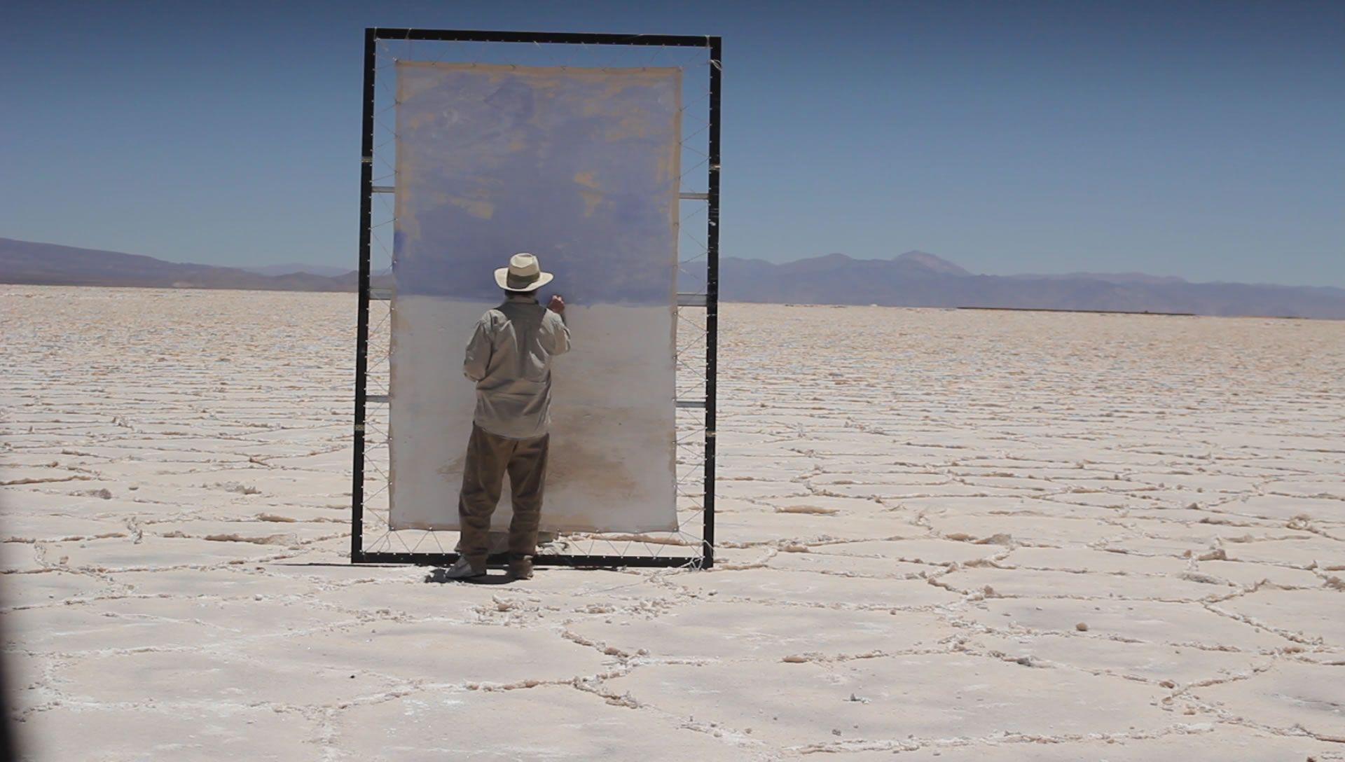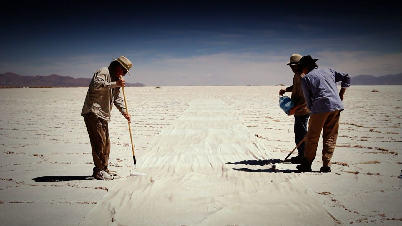 “Fui a la Puna, a las Salinas Grandes, a Tres Cruces. Me instalé en el salar. Pinté con pintura y con sal. También llevé una tela de 50 mts. de largo la mojé en las cavidades que hacen los salineros y luego la extendimos sobre la superficie geométrica del salar e hicimos un calco de esa superficie sobre la tela. La luz encandila y hace mucho calor”.