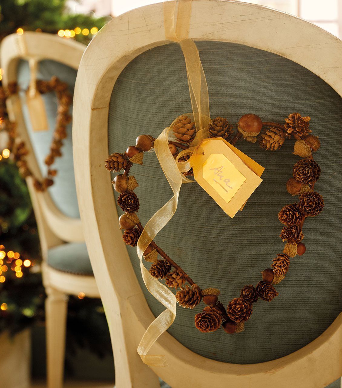 Decorar el respaldo de las sillas con un detalle navideño, es una opción muy llamativa. Puedes ponerle detalles como por ejemplo, piñas y bellotas, un moño con cintas alegóricas, una funda blanca y rama verde, etc., si la personalizas con el nombre de cada invitado, mucho mejor.