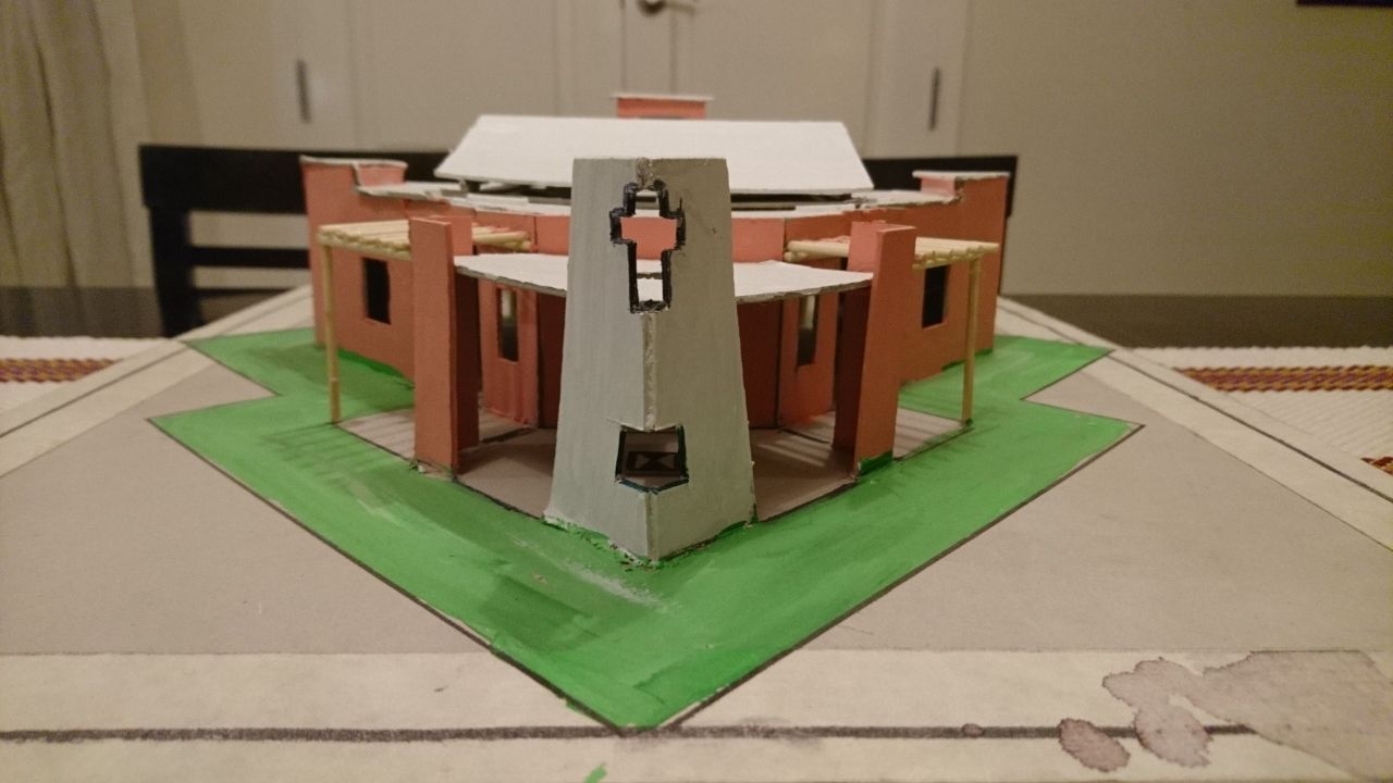 El diseño está basado en tres cuadrados que se ensamblan entre sí, con reminiscencias de las construcciones aborígenes con los contrafuertes inclinados para que su arquitectura tenga un correlato con el lugar. El uso de la piedra es fundamental porque durante mucho tiempo funcionó allí la Mina El Castaño, fuente de trabajo de los pobladores y emblema del lugar. Se sumó la madera de álamo en virtud de ser otro de los recursos naturales más importantes de Villa Nueva.
