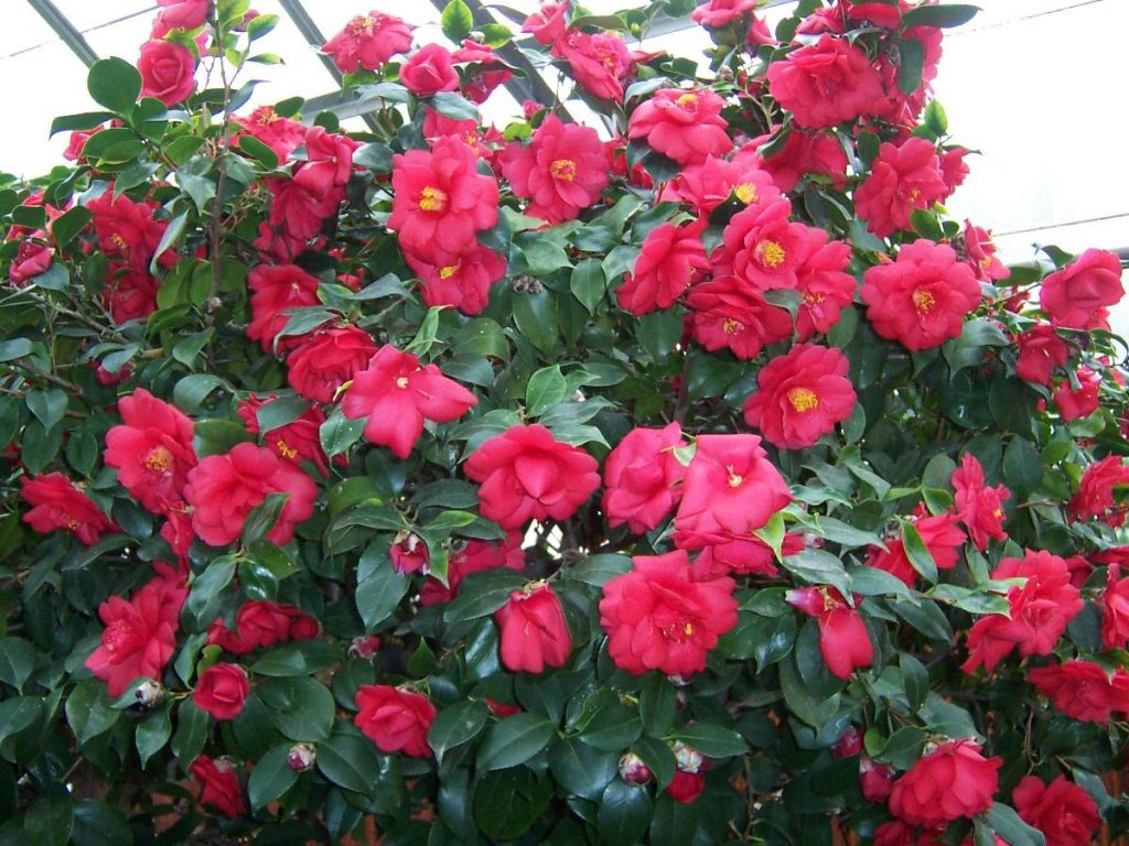 En plena floración, esta planta produce flores de espectacular belleza y hay miles de variedades cultivadas de la Camelia e híbridos. Esta planta es de origen oriental, llegó a Europa de la mano de los jesuitas. De hecho su nombre proviene de un padre jesuita, Camellus, que vivió en el siglo XVII. Hay más de 80 especies diferentes de árboles y arbustos e infinitas variedades de flores; todas ellas de gran belleza.