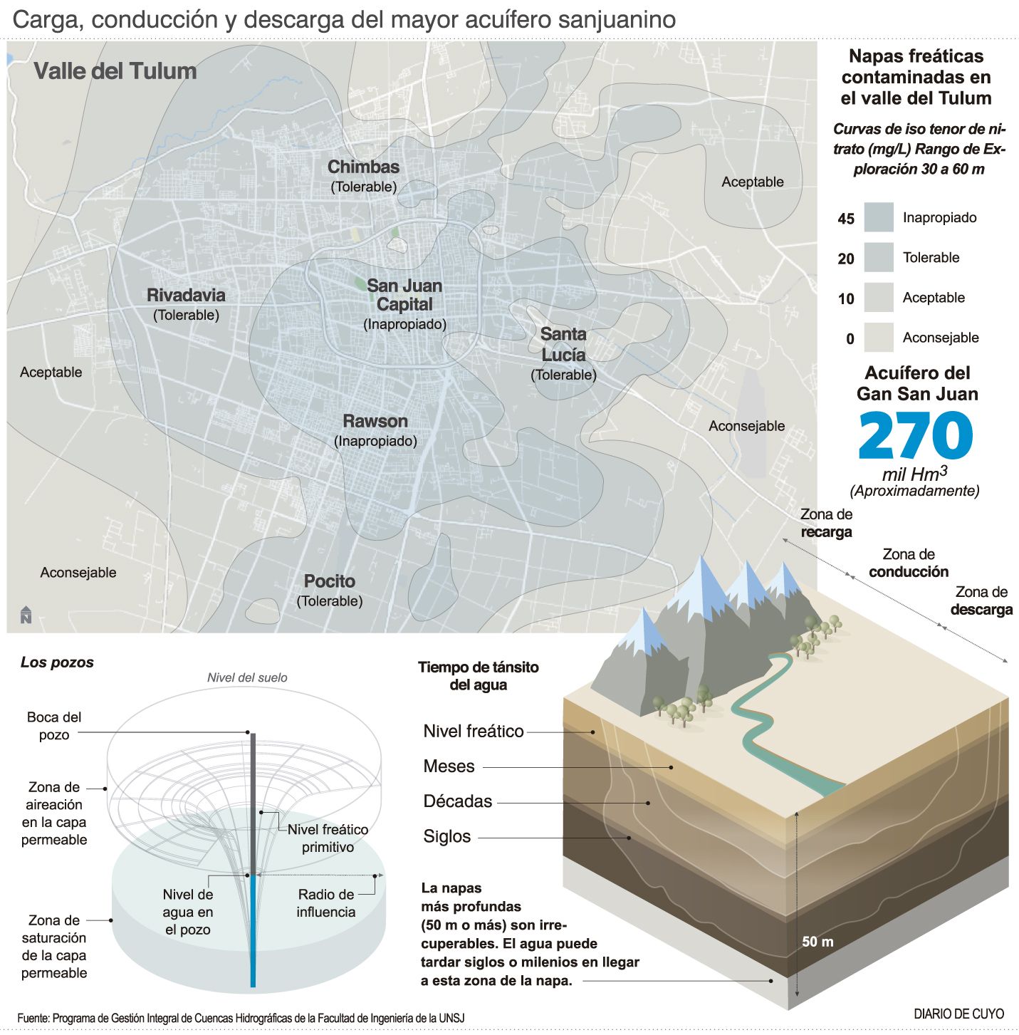 Así planteado, "el fortalecimiento del control sobre los acuíferos, tanto en calidad de agua como en su sobreexplotación, deberá tenerse como un objetivo prioritario para las autoridades del agua en la provincia", indicó el investigador agregando: "Supongamos que queremos suplir los 1.000 hm3 que el río San Juan no nos está entregando superficialmente, entonces en unos 30 años habremos eliminado de la cuenca subterránea unos 30 mil hm3, un vaciamiento irremediable y con consecuencias catastróficas incluso para la misma calidad de las aguas subterráneas por descenso de las manchas de nitratos que hoy están mas superficiales".
