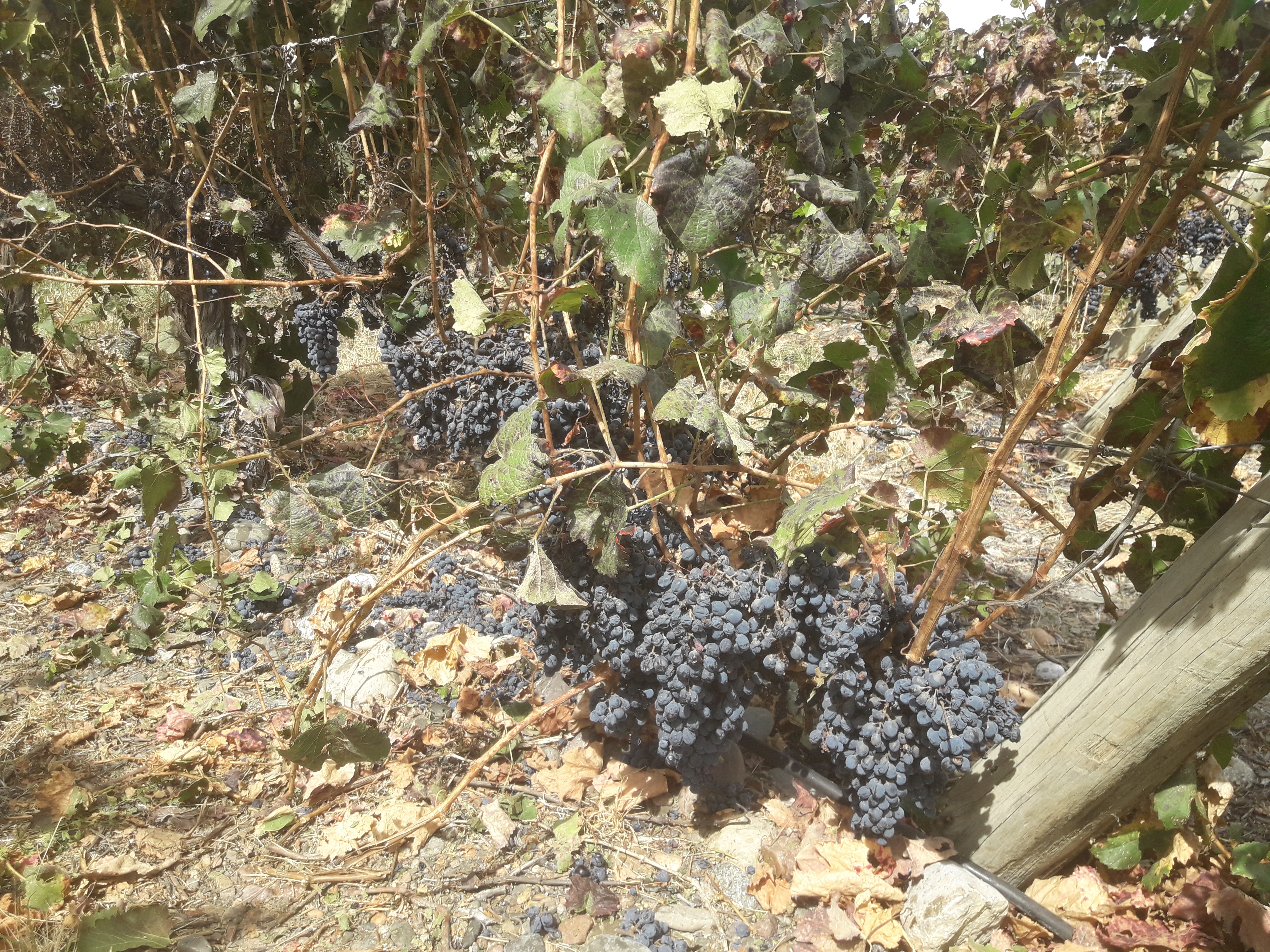 La vendimia sanjuanina está entrando en sus semanas finales y la esperada producción de 600 millones de kilos de uvas para esta temporada se está perdiendo en las viñas y parrales por deshidratación debido a la sobremaduración de los frutos y en otros casos a la pérdidas de hojas por peronóspora. En la foto aparece una viña de Malbec de una finca de Zonda con elevado tenor azucarino. Por esperar a que la bodega le dé la orden de cosecha, esta finca perdió 300 mil kilos por deshidratación. La uva tuvo su madurez óptima dos semanas atrás, pero la mala logística, falta de mano de obra rural, pocas bodegas bien tecnificadas, etc., hacen que no toda la uva se pueda moler en el momento justo. Este cuello de botella debe ser superado ya que por el momento San Juan no tiene la logística apropiada para moler más de 500 millones de kilos de uva. A tenerlo muy en cuenta.