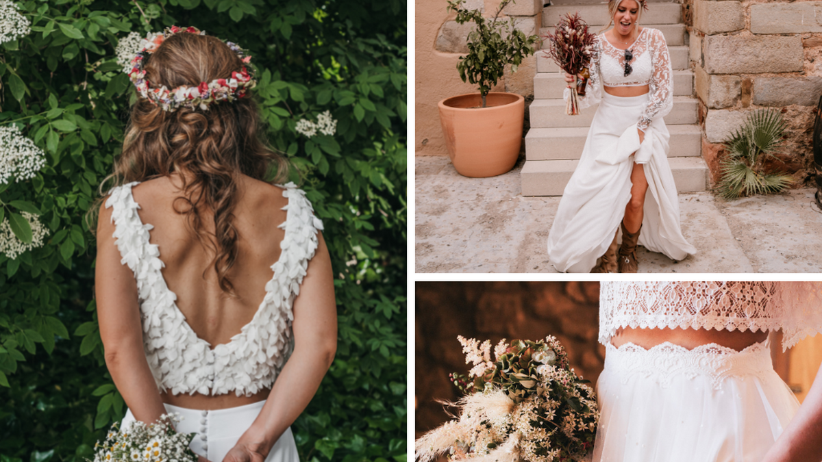 Marcar la diferencia es una de las señas de identidad de las novias actuales. Por eso los looks dos piezas se han convertido en propuestas ideales para las novias que buscan un look original y atrevido, a la par que sensual. La multitud de posibilidades que ofrecen este tipo de looks permiten a las mujeres crear el diseño con el que sentirse más identificadas a través de un top y una falda que confeccionan el diseño. Son muchas las marcas que han empezado a incorporar este tipo de look en sus colecciones y existen cientos de posibilidades que combinan desde diseños lisos, con encaje o tattoo lace a diseños con complementos como volantes o faldas cortas o midi.