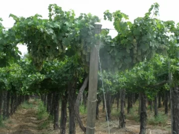 Entrado el año 2000 el Viognier era una uva desconocida para los sanjuaninos. Originaria de Francia y con poca trascedencia como varietal, el cepaje desembarco en el cálido clima sanjuanino para ganarse un lugar cuando muchos no apostaban por él. El Viogner es una variedad muy adaptada al clima y suelo sanjuanino a tal punto que hoy gana mercado y prefrencia entre los blancos. En la foto puede verse la gran producción que entrega. Pertenece a un viñedo de 9 de Julio y está injertado sobre un pie de Cabernet Sauvignon.