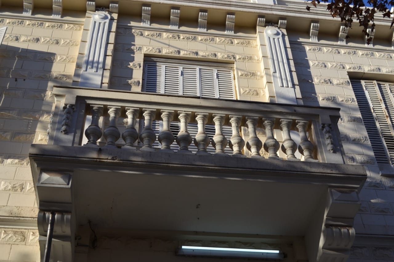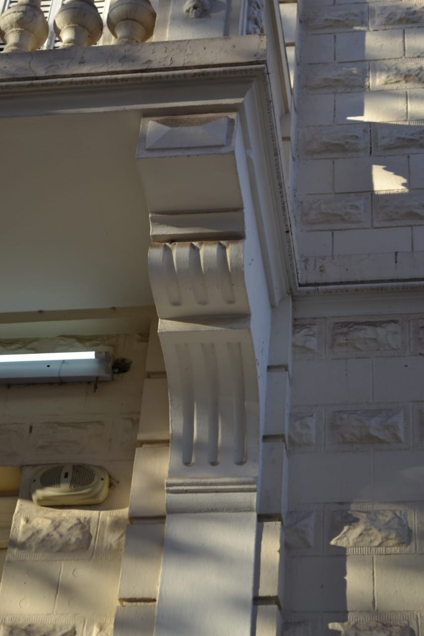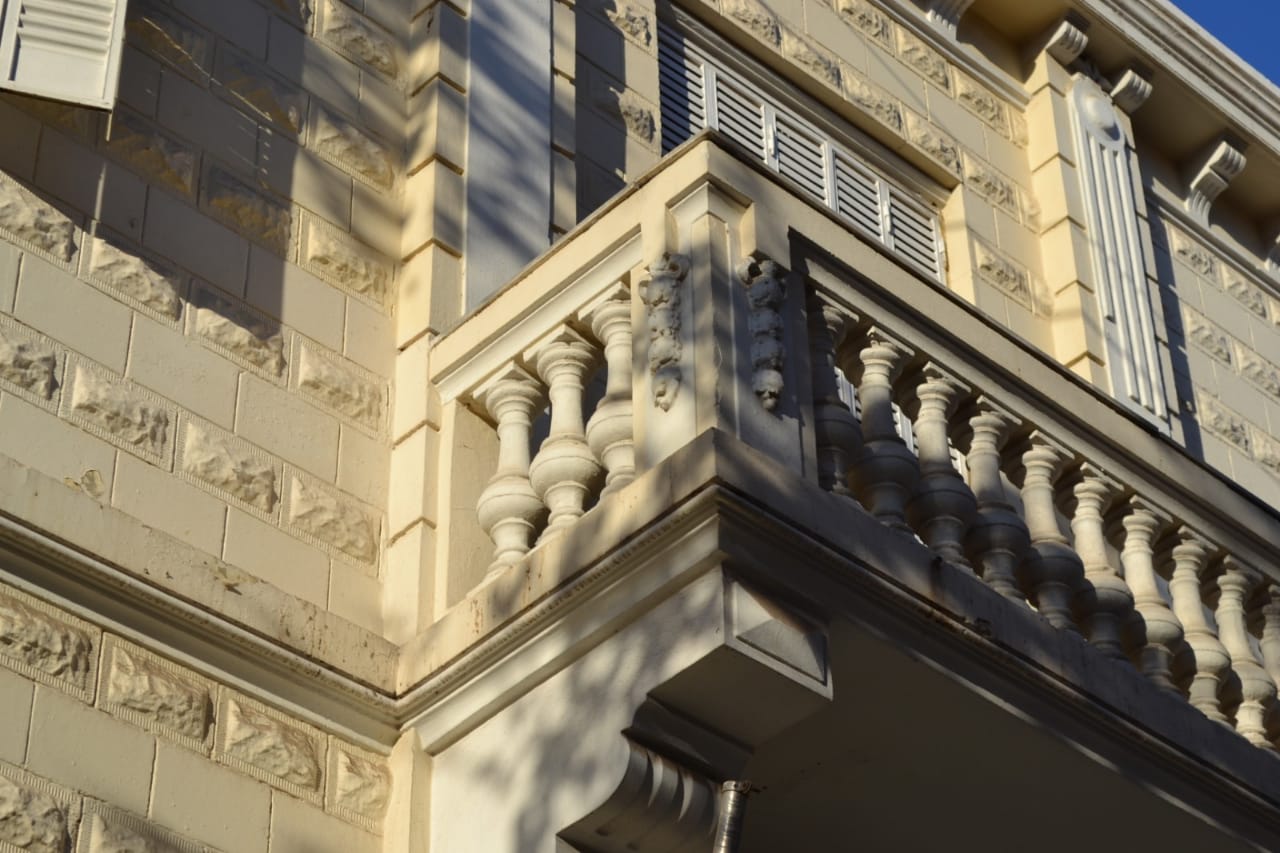 Se destaca en su frente las molduras de remate del edificio con sus ménsulas que aparentan sostener las cornisas, guirnaldas y el balcón de la fachada con su balaustrada, el diseño en sobrerrelieve de las paredes dando el aspecto de piedras (que fueron traídas de Europa), los grandes ventanales, como así también los postigones metálicos.