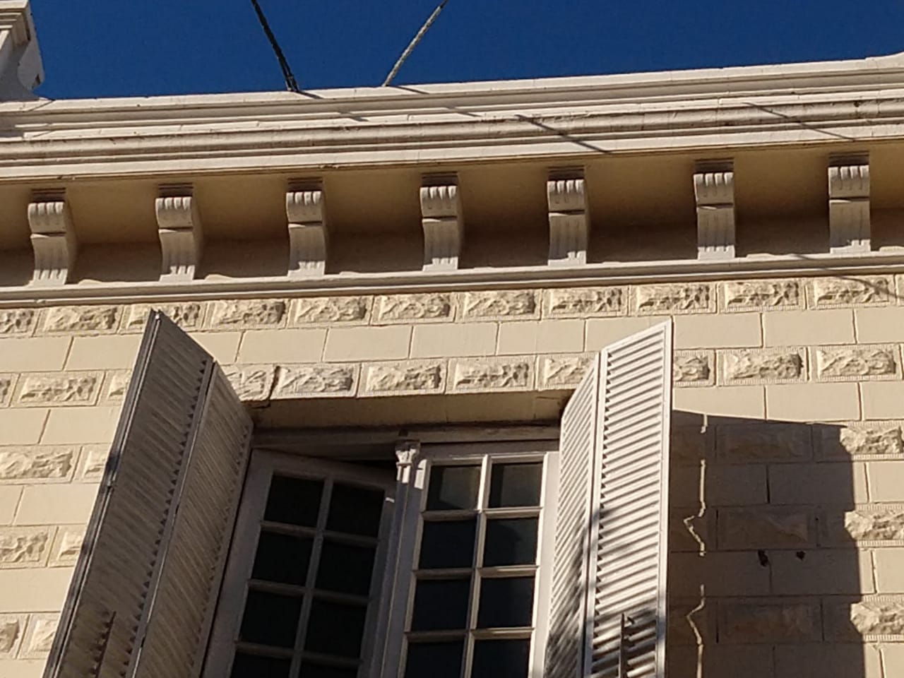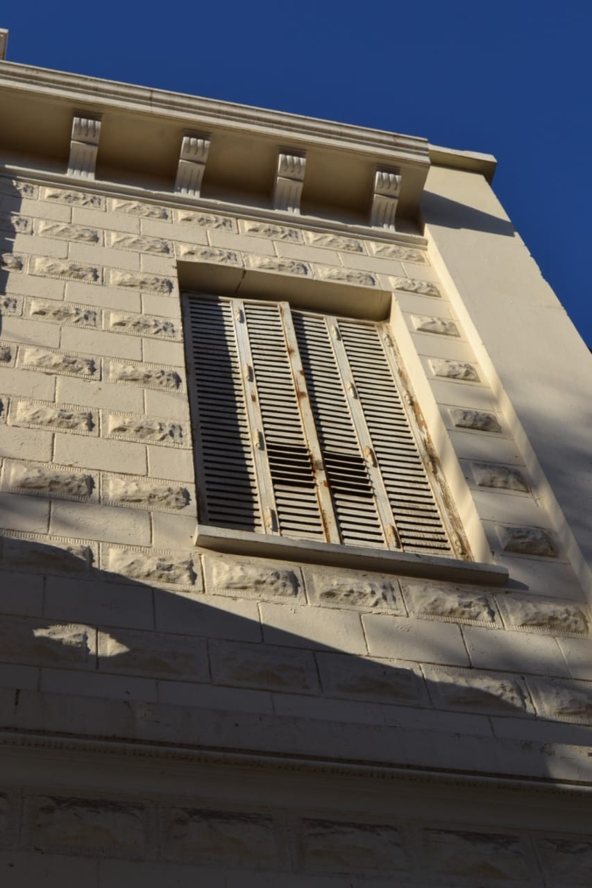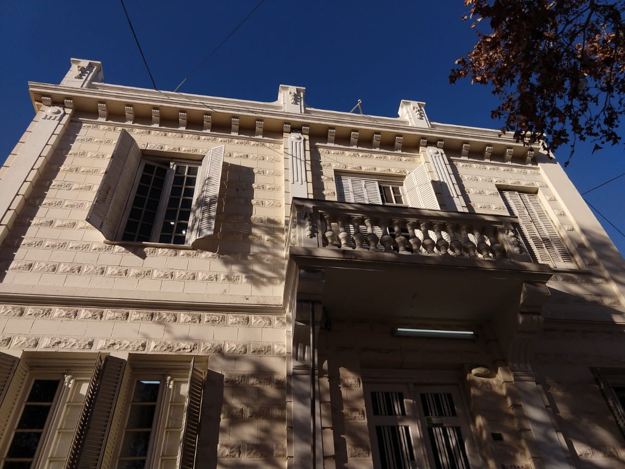 Se destaca en su frente las molduras de remate del edificio con sus ménsulas que aparentan sostener las cornisas, guirnaldas y el balcón de la fachada con su balaustrada, el diseño en sobrerrelieve de las paredes dando el aspecto de piedras (que fueron traídas de Europa), los grandes ventanales, como así también los postigones metálicos.
