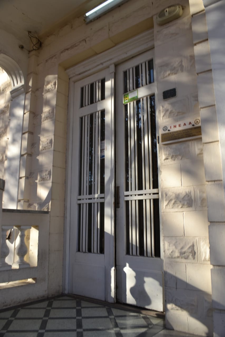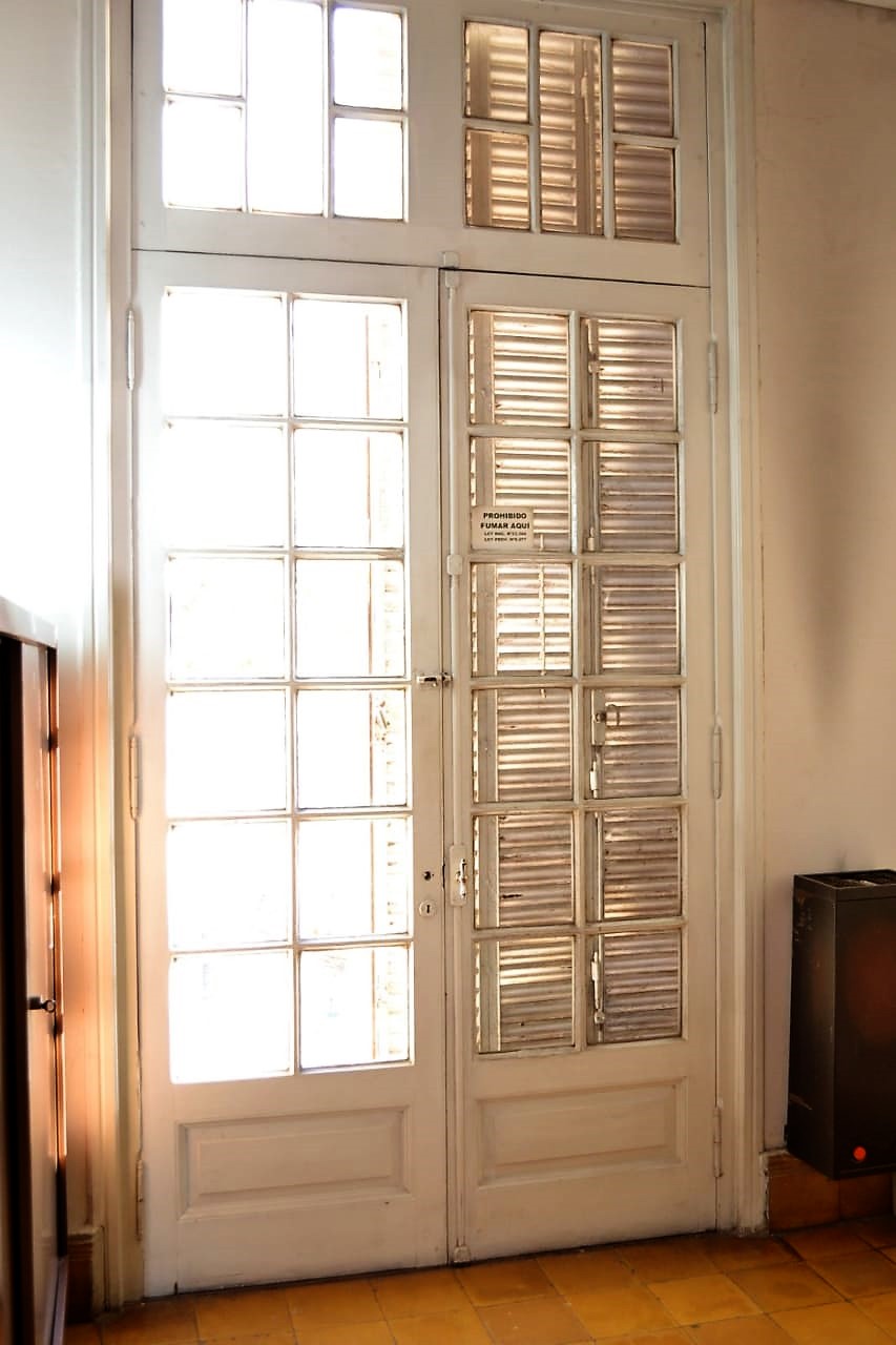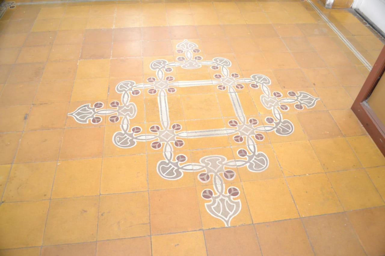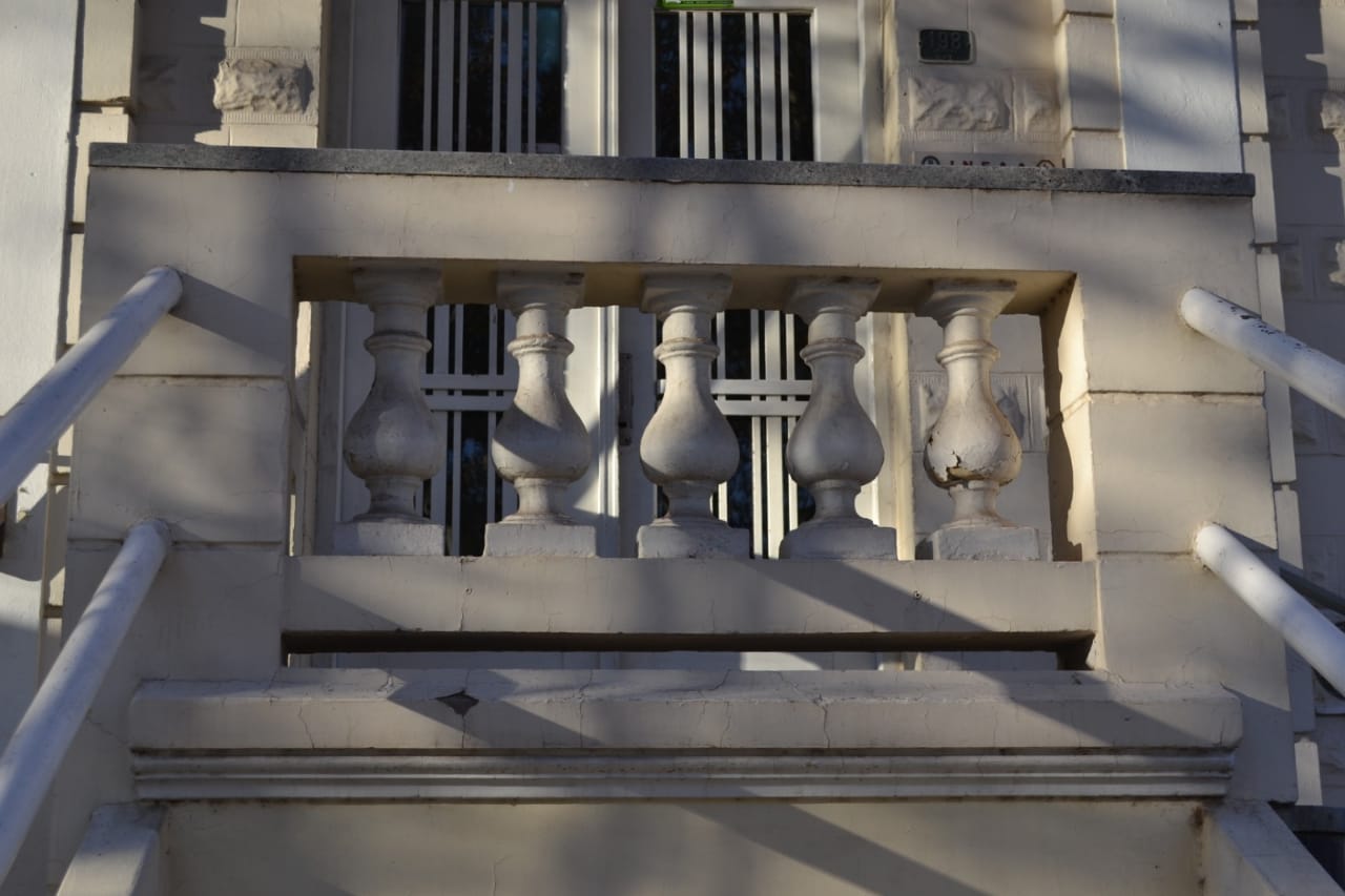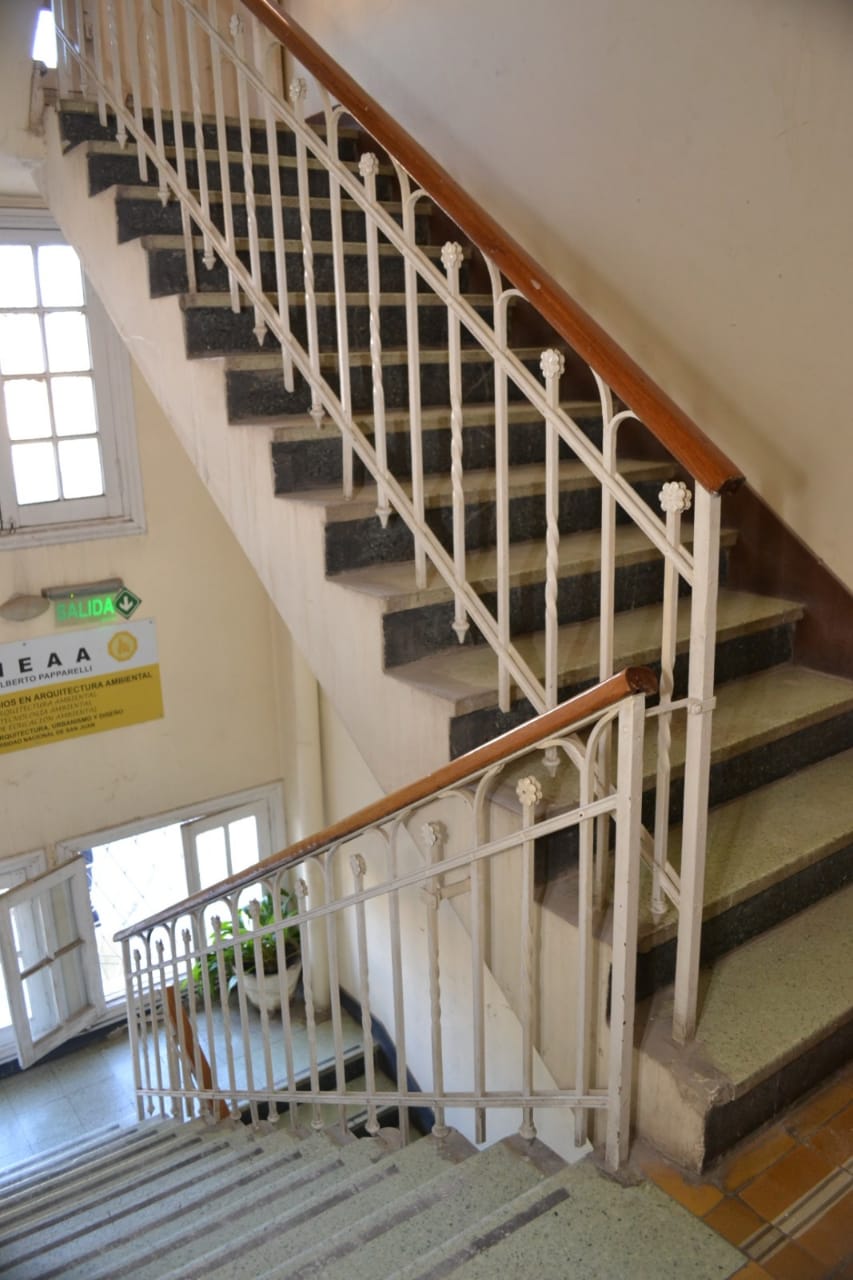 En el núcleo central del edificio se encuentra la escalera que nos lleva al subsuelo y al primer piso. En ella se destaca su baranda, trabajo realizado en herrería forjada y con algunas reminiscencias del Art Noveau, que se hallaba en pleno apogeo en nuestro país. Los pisos de granítico de la escalera complementan y refuerza este concepto.