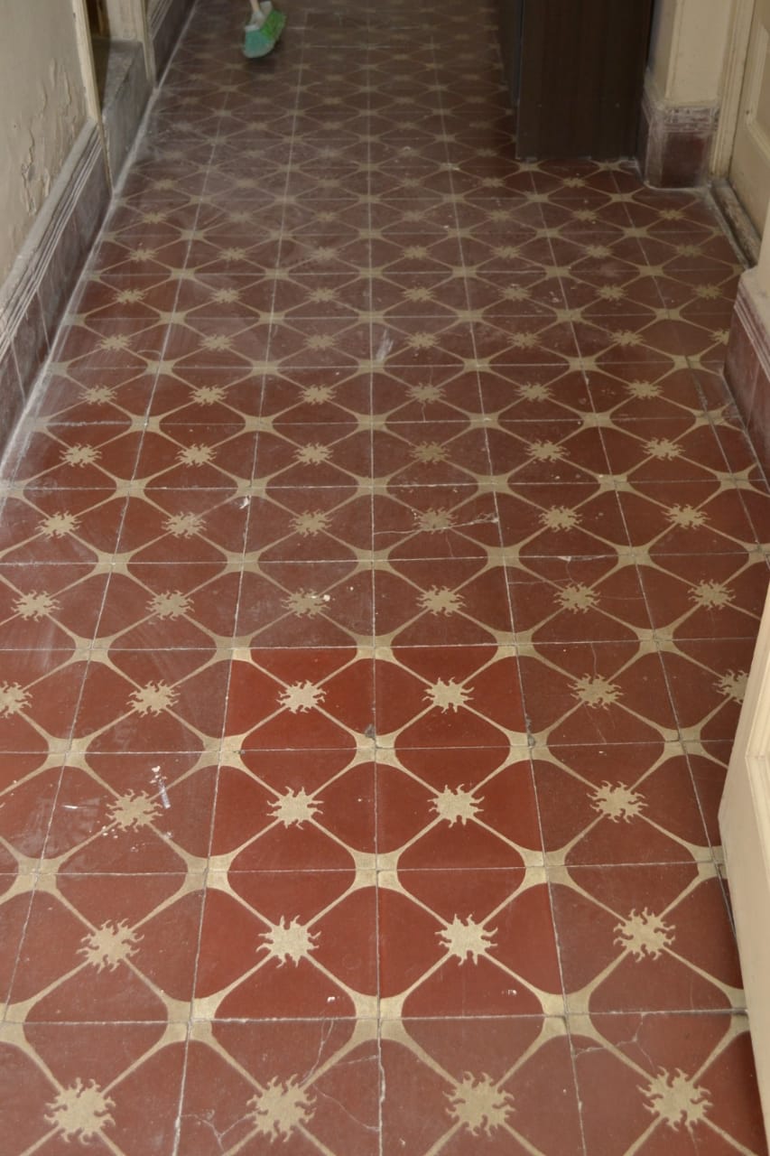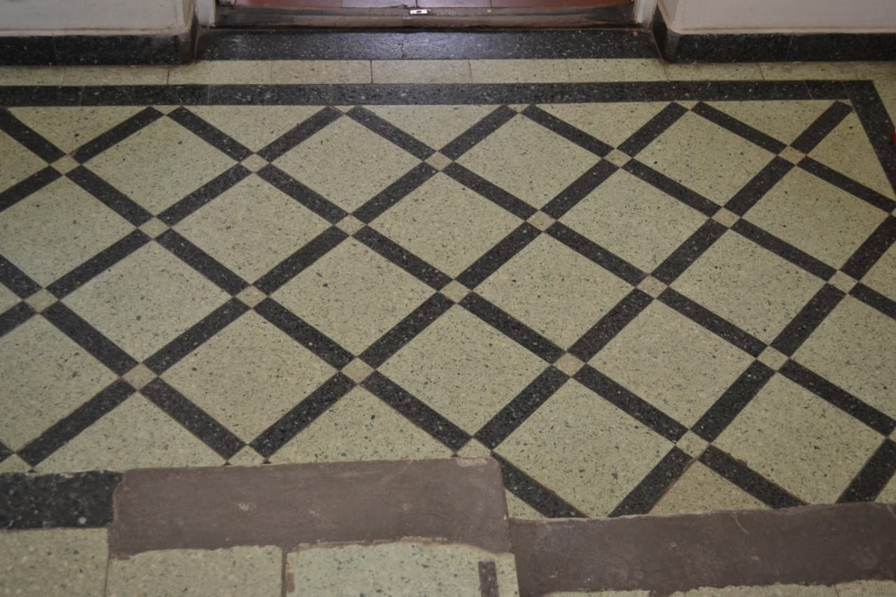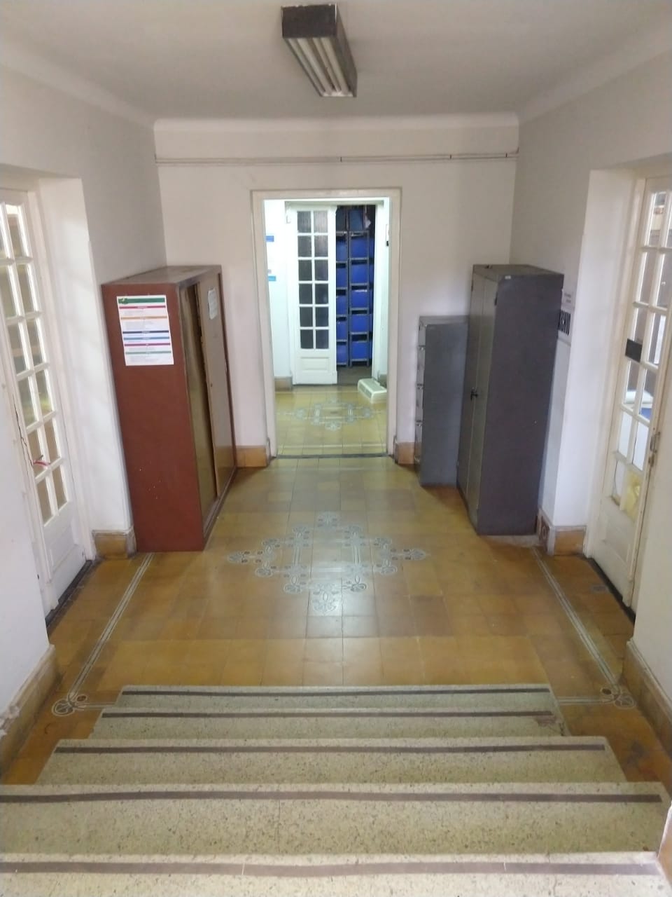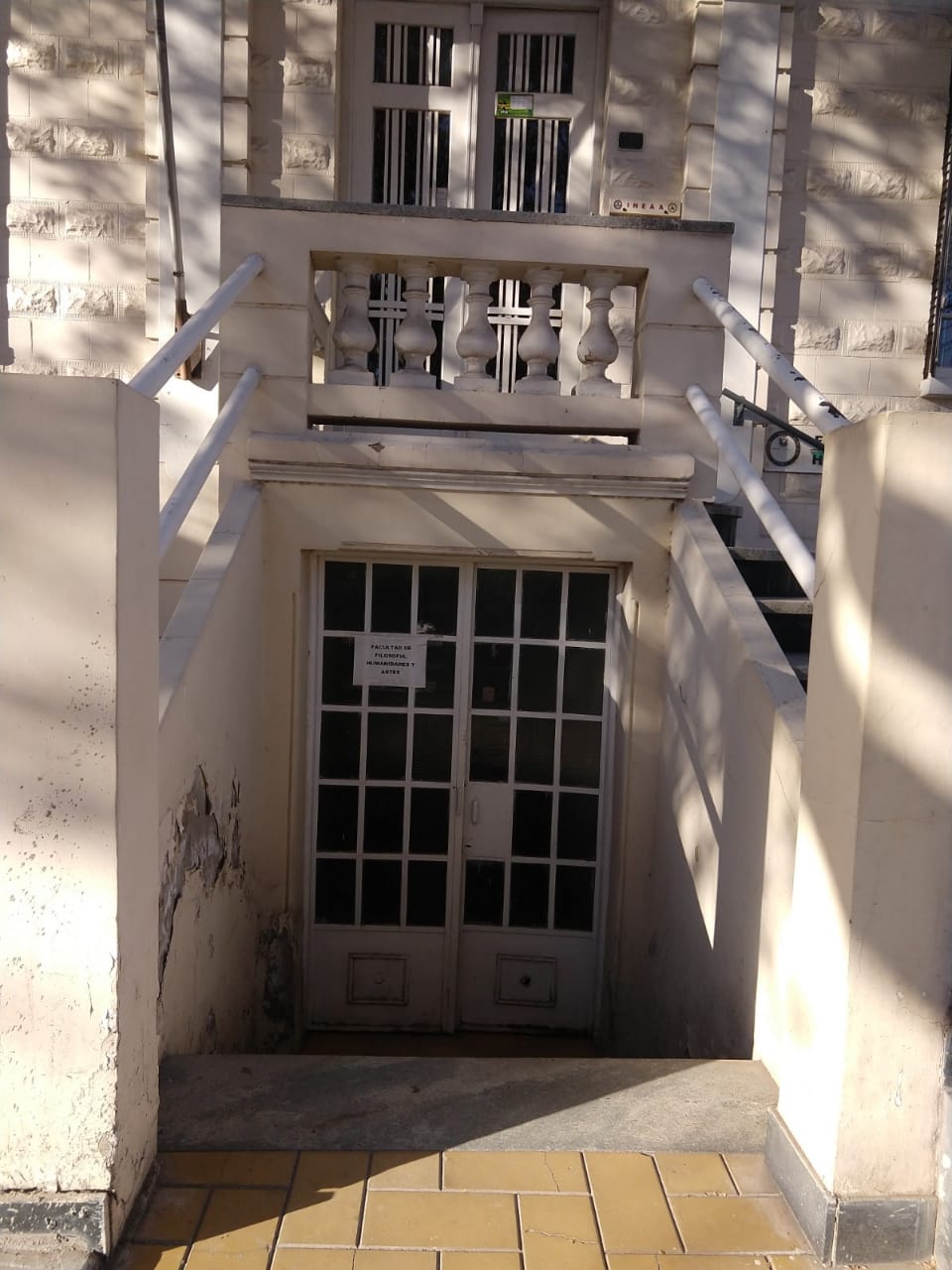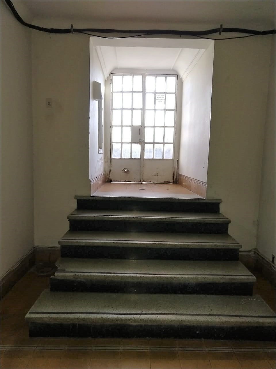 En el núcleo central del edificio se encuentra la escalera que nos lleva al subsuelo y al primer piso. En ella se destaca su baranda, trabajo realizado en herrería forjada y con algunas reminiscencias del Art Noveau, que se hallaba en pleno apogeo en nuestro país. Los pisos de granítico de la escalera complementan y refuerza este concepto.
