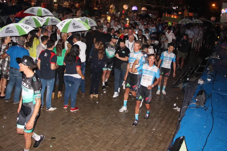 vuelta a san juanLa lluvia sólo permitió el desfile de equipos y después obligó a suspender el show y el prólogo