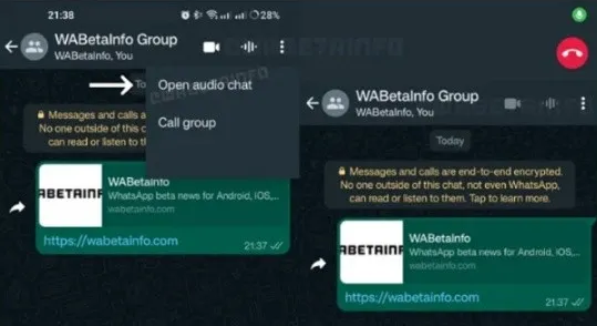 Esta nueva característica todavía no está operativa. Sin embargo, lo que si puedes ver en estas imágenes es que si pulsas sobre la opción de abrir un chat de audio dentro del grupo aparecerá un botón circular con el fondo de color rojo y un teléfono en el centro en la esquina superior derecha que te permitirá finalizar la conversación.