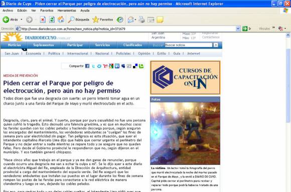 Esta semana esta comunidad virtual también llamó la atención sobre un hecho. Con asombrosa inmediatez apareció el martes en el "muro" -como se le llama al espacio en el cada usuario actualiza sus noticias y las comparte- de un "facebokero" sanjuanino la imagen de un perro tendido al lado de una farola y un charco de agua. Asi se difundió el primero y uno de los pocos registros de imagen del hecho que desencadenó una serie de acontecimientos que terminó con la clausura por varias horas del Parque de Mayo.
