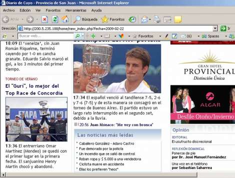 Uno de los casos emblemáticos, que sirve como ejemplo, se registró en la edición del 22 de febrero último, cuando la boda de María del Pilar Caballero González con José Antonio Adaro Castro fue lo más leído del domingo. Así, la historia de amor de dos estudiantes que estuvieron siete años de novios, destronó a otros hechos como un incendio que destruyó un galpón en Trinidad o un accidente de tránsito que se cobró la vida de un ciclista en Rawson. Cabe resaltar que ese no fue un día con pocas noticias, ya que hubo muchas novedades para los amantes del deporte: jugaron River, Boca y San Lorenzo, el tenista Tommy Robredo ganó la Copa Telmex y el piloto sanjuanino Henry Martín chocó durante una competencia de Top Race. Además, por la noche el mundo del espectáculo se vistió de fiesta para conocer los ganadores de los premios Oscar, que entrega la Academia de Hollywood.