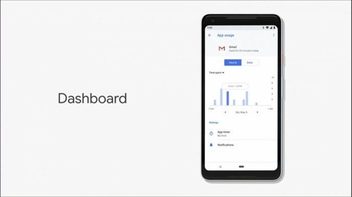 Se trata de una serie de herramientas, entre ellas Android Dashboard que muestra el tiempo de uso del usuario según las apps; Wind Down, que torna la pantalla a un modo monocromo para hacerla menos “atractiva”; App Timers, para configurar el tiempo que se debe pasar en una app, y finalmente un modo “No molestar” renovado y mejorado.