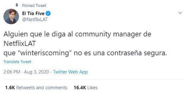 También fijo un tweet que dice: “alguien que le diga al community manager de NetflixLAT que ‘winteriscoming’ no es una contraseña segura”.
