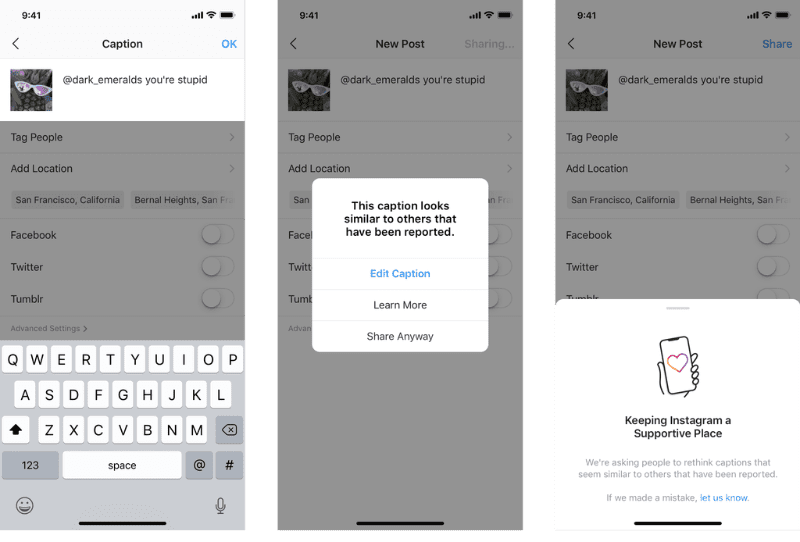 A partir de hoy la red social de fotos y videos lanza una nueva función que le notifica a los usuarios cuando la descripción de sus fotos y videos pueden resultar ofensivos; dandoles la posibilidad de, según afirman en su web, "pausar y reconsiderar sus palabras antes de publicarlas".