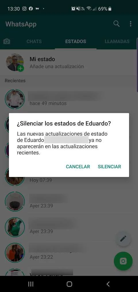 Es posible silenciar los estados de otra cuenta dentro de cada uno de los estados, a través de las opciones, ilustradas por un icono de tres puntos, que se encuentran en su interior.