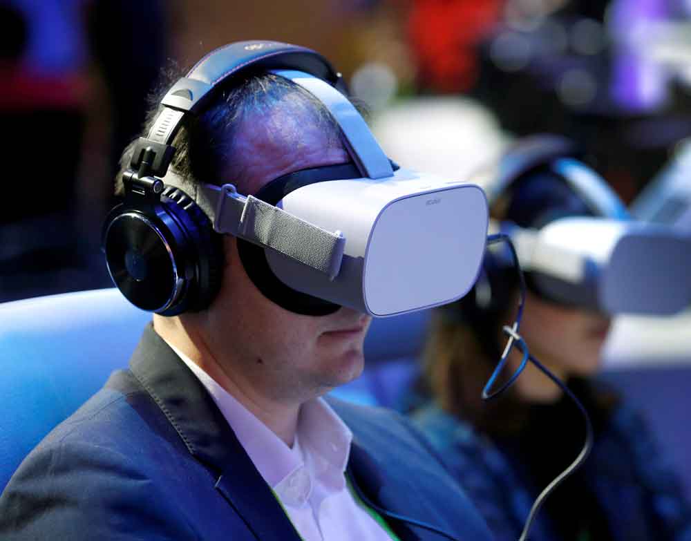 2 Los asistentes usan audífonos Oculus Rift mientras utilizan un disco de realidad virtual en el stand de Panasonic.