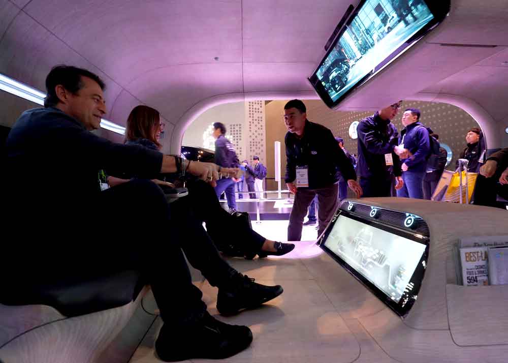 4- Pasajeros en la cabina autónoma SPACe_L de Panasonic, un concepto interior para un vehículo autónomo de lujo.