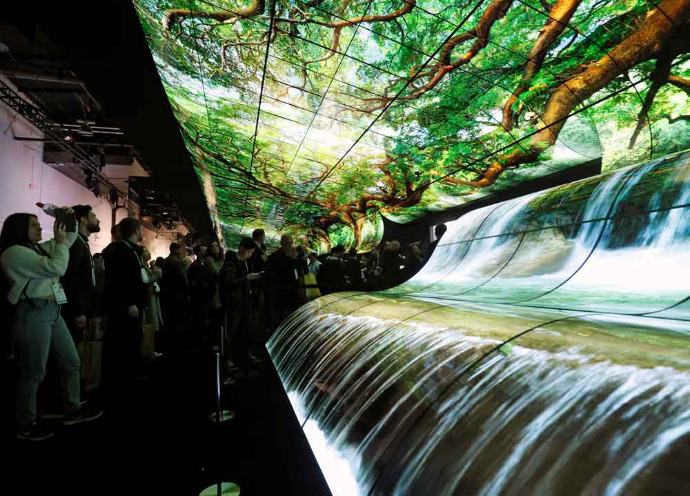 5- Una mujer toma una foto de una pantalla con tecnología OLED curvas en el stand de LG Electronics.