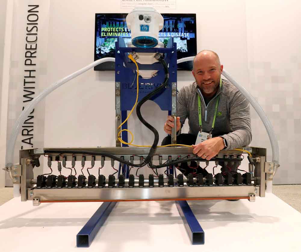 7- Will Pell, director de ingeniería de Blue River Technology, presenta un sistema "See & Spray" que distingue la diferencia entre cultivos y malezas.