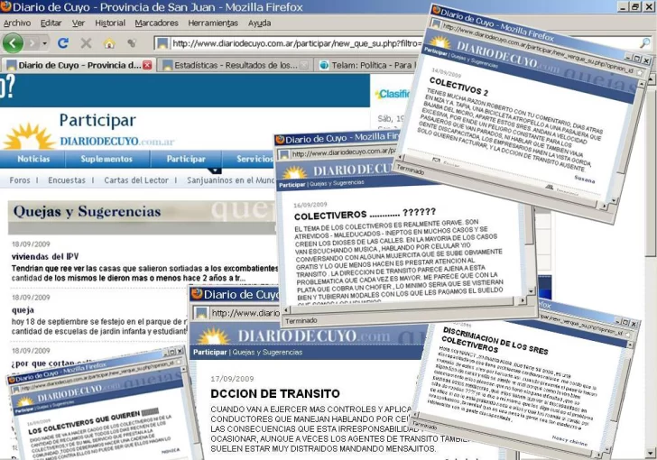 "¿Cuándo las autoridades van a ejercer controles estrictos y aplicar multas a los choferes que manejan hablando por teléfono y que no miden las consecuencias que esta irresponsabilidad puede ocasionar?", preguntó Soledad. Haciéndose eco de la repercusión que tuvo el tema en la web de DIARIO DE CUYO, Mónica planteo "hacer una cadena de reclamos para que alguien haga algo". El manto de piedad para con los choferes lo aportó Cecilia, quien cree "que deberían ponerse (los lectores que critican) de ambos lados. Es verdad que hay choferes que dejan mucho que desear cuando están mal vestidos, hablan por teléfono o van charlando, pero también hay muchos choferes que no lo hacen". Las quejas y sugerencias de esta semana en la página digital del diario marcharon, más que nunca, sobre ruedas.