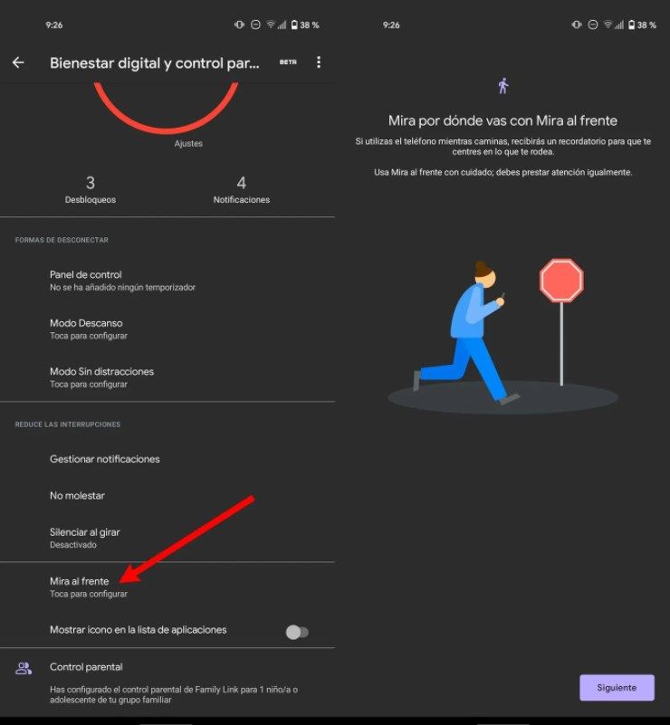 Para activar "Mira al frente" se debe ir a los ajustes del celular Android, luego ir a "Bienestar Digital" e ingresar a "Mira al frente".