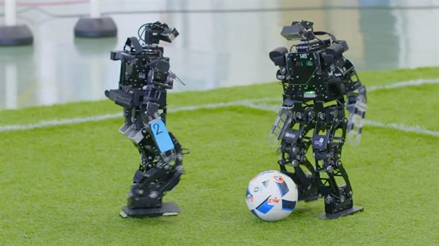 Humanoides o robots con forma de cubo se mueven tras una pelota en una pequeña cancha de pasto artificial, en un ensayo destinado a conseguir lo que se proponen los organizadores del encuentro: desarrollar autómatas capaces de disputar un partido de fútbol para vencer al futuro campeón del mundo en 2050.