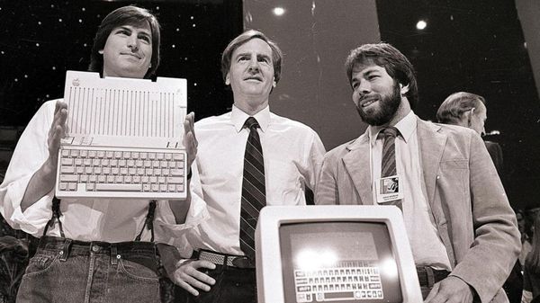 Steve Jobs, John Sculley y Steve Wozniack, en la presentación de la computadora Apple II