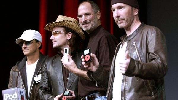Steve Jobs junto a Jimmy Iovine, director del sello discográfico Interscope Geffen A&M Records, Bono y el guitarrista de U2 The Edge en el lanzamiento del iPod el 26 de octubre de 2004 en San Jose, California.
