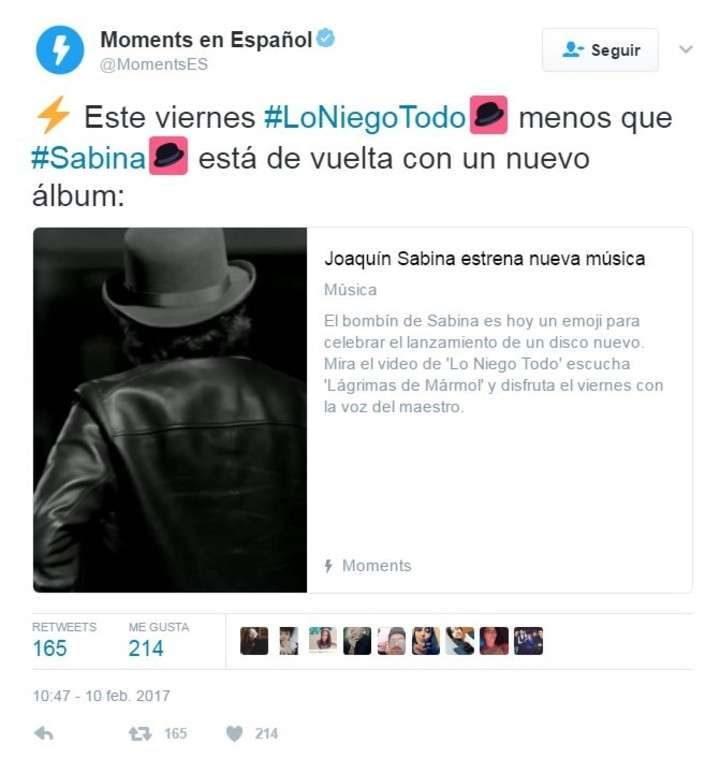 Los habitué de la red social Twitter y fanáticos del cantante español Joaquín Sabina, podrán derse el gusto de homenajearlo. Con solo utilizar los hashtag #LoNiegoTodo o #Sabina aparecerá automáticamente un emoji con el títpico bombín, diseñado exclusivamente para la ocasión.