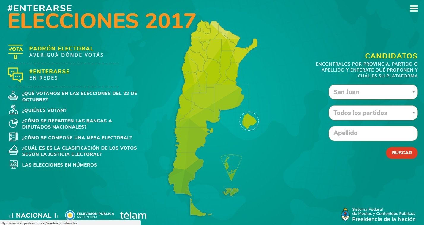 La plataforma interactiva de Medios Públicos www.enterarse.com.ar ofrece en estas elecciones legislativas del 22 de octubre toda la información ciudadana para asistir a votar y ampliar la experiencia de cada usuario.