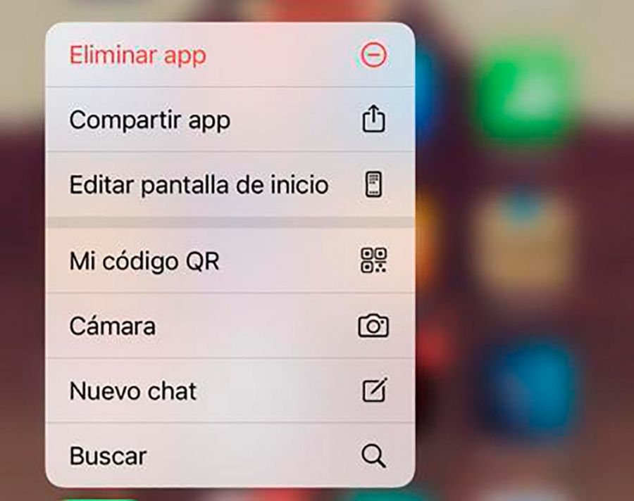 Cuando uno supone que conoce todos los secretos de esta app, en realidad, no es así. Hay menús ocultos muy útiles que no todos los usuarios han descubierto. Simplemente hay que pulsar un segundo sobre el ícono de esta aplicación para que se despliegue una pantalla con opciones. Entre ellas, las opciones "Eliminar app", Compartir app", "Editar pantalla de inicio", "Mi código QR", "Cámara", "Nuevo Chat" y "Buscar".