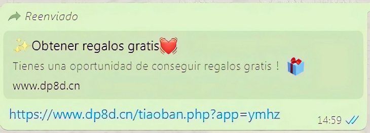 La estafa tiene fines publicitarios y de monetización web. Al hacer click en el enlace (https://www.dp8d.cn/tiaoan.pp?ap=yz), el mismo se reenvia de manera automática a todos los contactos de WhatsApp.