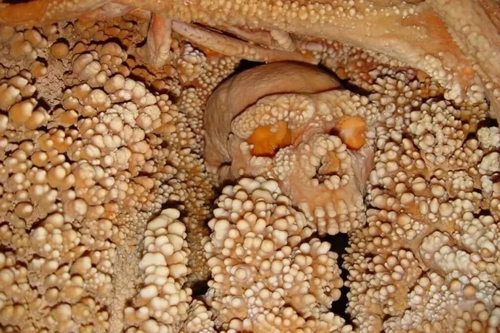 El cráneo, junto con un desordenado conjunto de huesos esparcidos a su alrededor, ofrecía una visión detallada de la anatomía neandertal. Atrapados dentro de una masa de estalactitas y calcita, los restos no se encontraban en su forma original, sino embellecidos por la naturaleza misma. Estos depósitos de caliza, formados por el constante goteo de agua en la cueva durante miles de años, cubrían las cuencas oculares, el hueso nasal y la mandíbula superior, otorgándole al esqueleto un aspecto casi decorativo, como si poseyera cientos de piercings naturales.