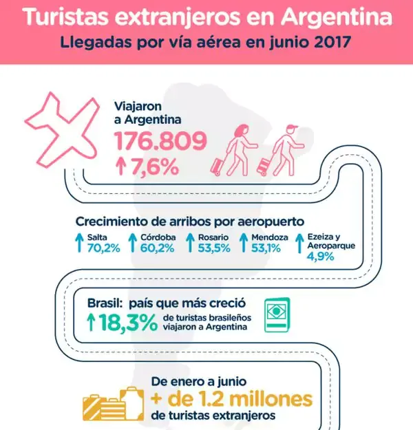 Los datos surgen de la habitual Encuesta de Turismo Internacional (ETI) elaborada por el INDEC, que arroja para el sexto mes del año un aumento del 4,9 por ciento en los arribos al Aeroparque Jorge Newbery y el Aeropuerto de Ezeiza. Y un informe del Ministerio de Turismo de la Nación agrega que, al sumar las estaciones aéreas de Mendoza, Córdoba, Rosario, Salta y del resto del país, la suba llega en total al 7,6 por ciento.
