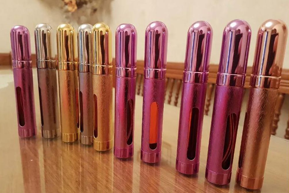 En forma de labial. Este modelo es muy buscado por su tamaño más pequeño y por su apariencia. También los hay en forma de llaveros y el envase tradicional de aerosol.