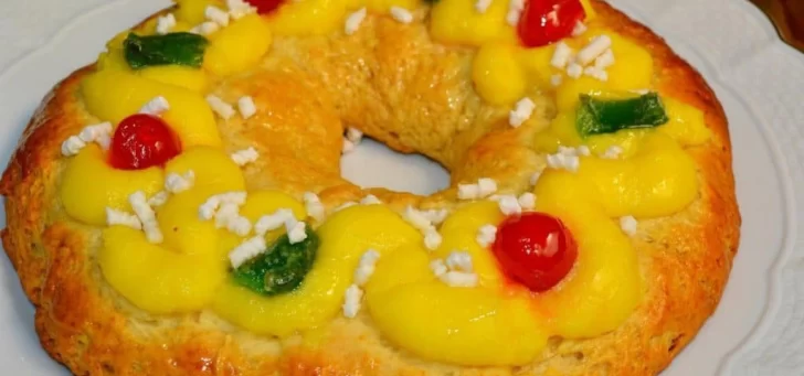 Se trata de un tipo de pan leudado, es decir, fermentado con levadura, algo dulce y pegajoso, que se decora -en su versión tradicional- con crema pastelera, cerezas y huevos.