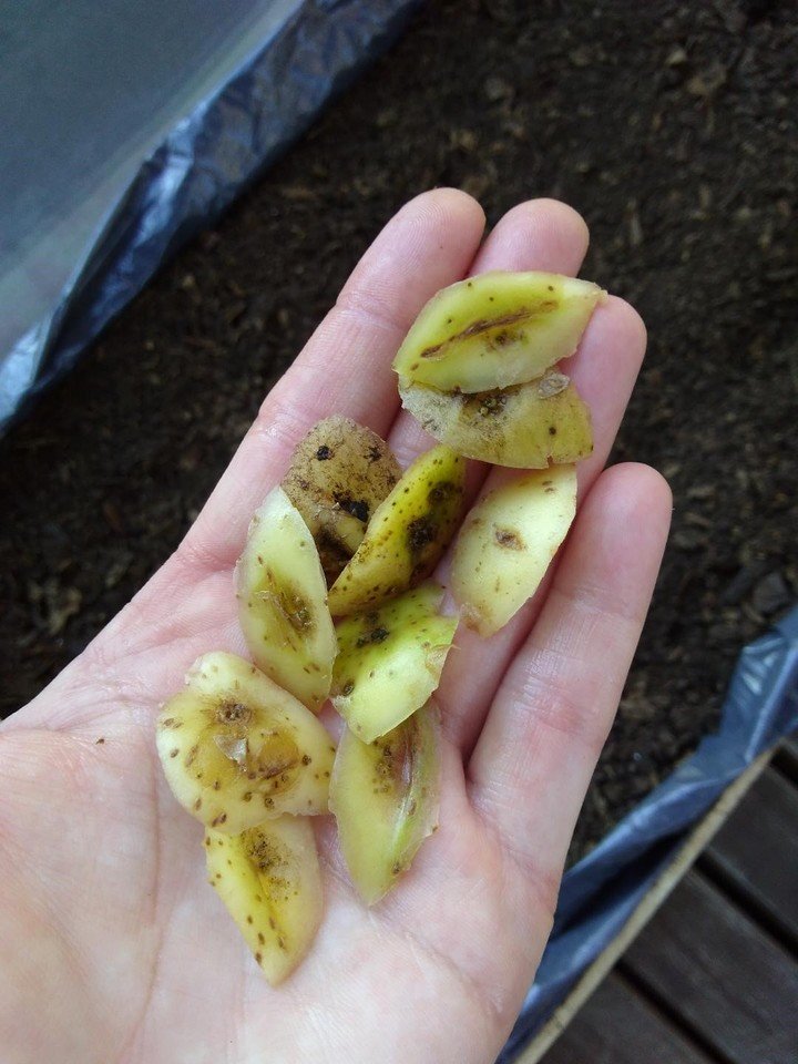 Antes de pelarlas, cortar unos pedacitos que tengan los “ojitos”, que es de donde salen los brotes. Plantarlos directamente en tierra. ¡A los días van a brotar las plantitas y, en unos meses, a cosechar papas!