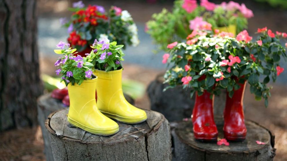 Si tienes botas de agua que ya no utilices, puedes llenarlas de sustrato y cultivar una plantita en cada una y quedarán muy bien. Como son de material impermeable, no necesitarás hacer nada con ellas, solamente unos pequeños agujeros en la suela.