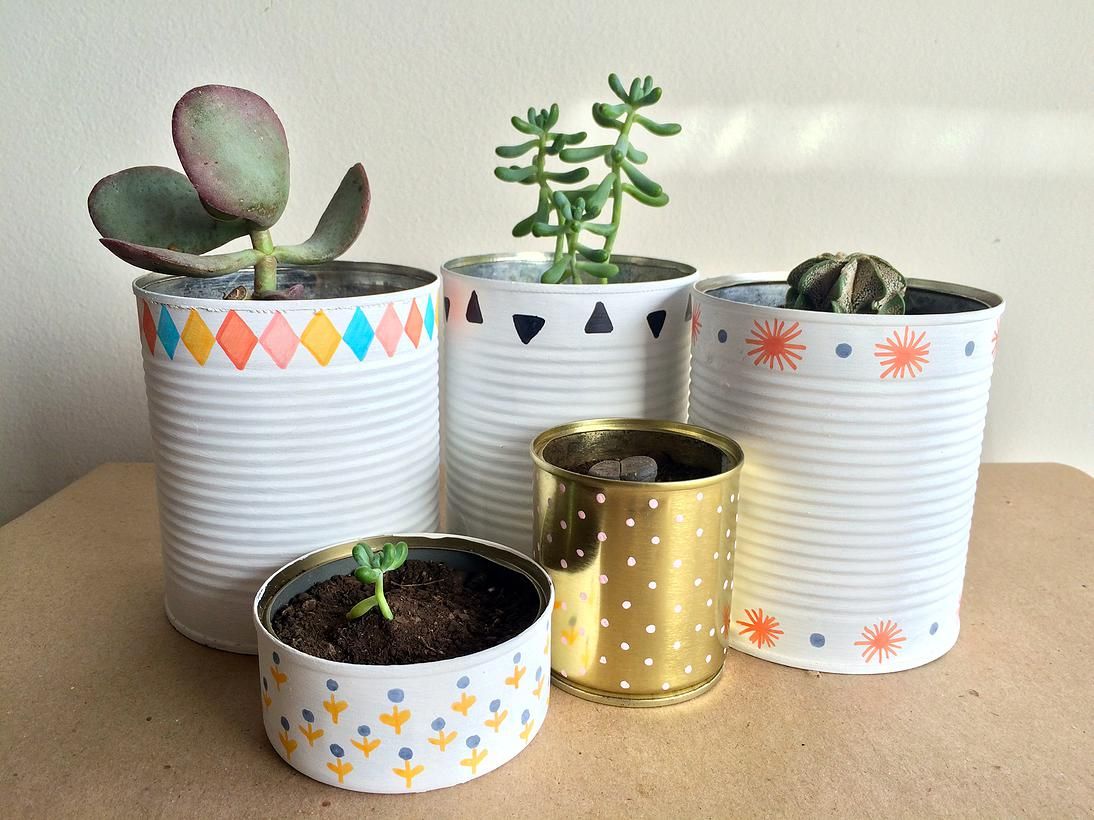 Esta es una de las formas más sencillas de reutilizar materiales. Puedes cultivar pequeñas plantitas en latas de bebida y también aprovechar las latas de conservas. En este caso, hay dos cosas que es importante hacer: una es hacer unos pequeños agujeros en la base, para que la lata drene bien y las raíces de la planta no se ahoguen. Y la otra es recubrir el interior de la lata con un plástico, para que el agua no la oxide y hacer agujeros también en el fondo. Es una buena idea para exterior y puedes poner varias latas juntas, creando un conjunto original.