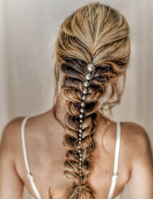 Esta técnica consiste en usar un hilo transparente e ir hilando las perlas y uniéndose con el pelo para que parezca parte del peinado. Esto puede emplearse con extensiones o con tiras de perlas ya hechas. Los hilos son una buena opción para los peinados recogidos o los semi recogidos.