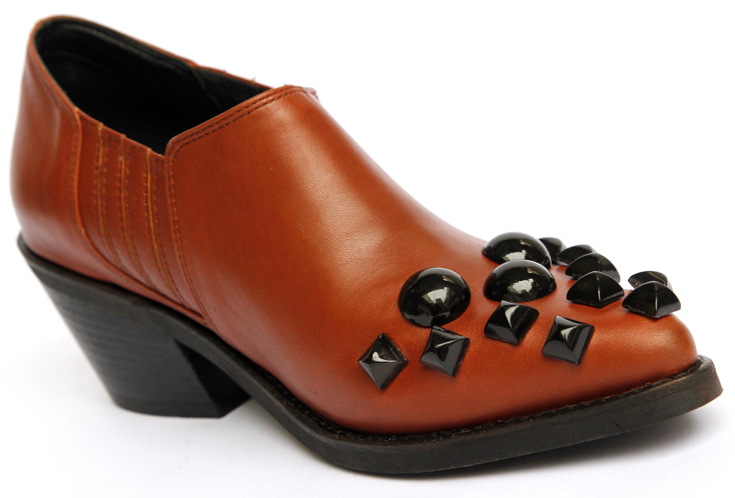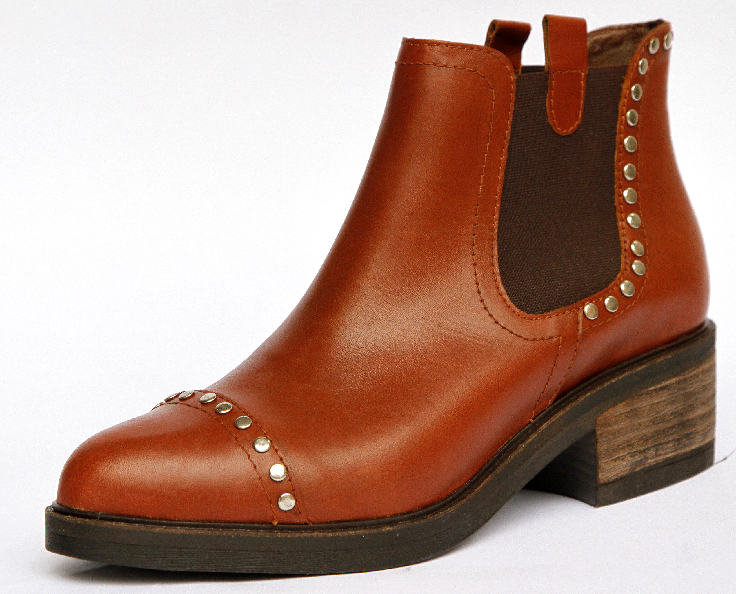 Botas caña baja con taco de madera y goma, puntera reforzada, elásticos y tachas en el frente y el talón ($3.490, R.S).