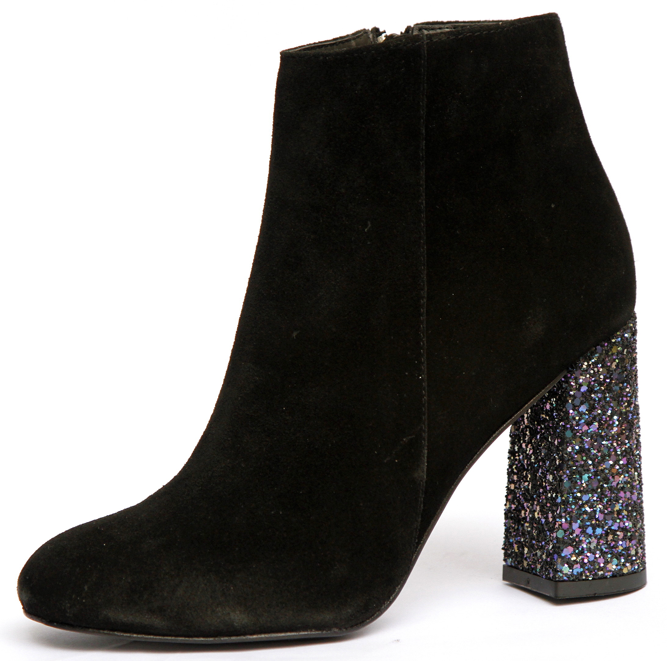Botas caña media de gamuza con la punta redonda y el taco de gibré tornasolado ($4.995, R.S).