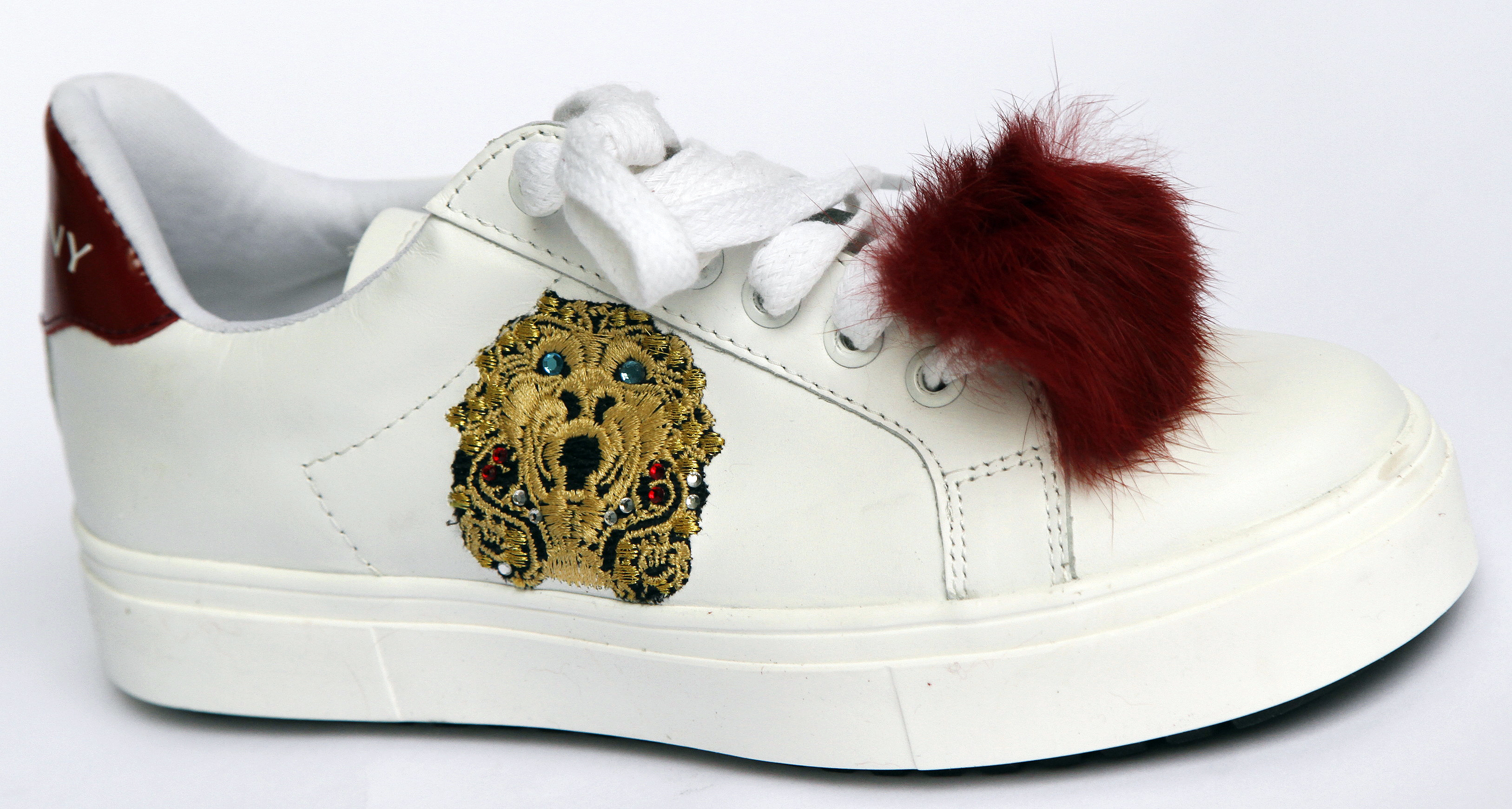 Zapatillas de cuero acordonadas con bordados de hilo brillante y strass en los laterales. Lleva un aplique de piel de conejo en el frente ($3.550, R.S).