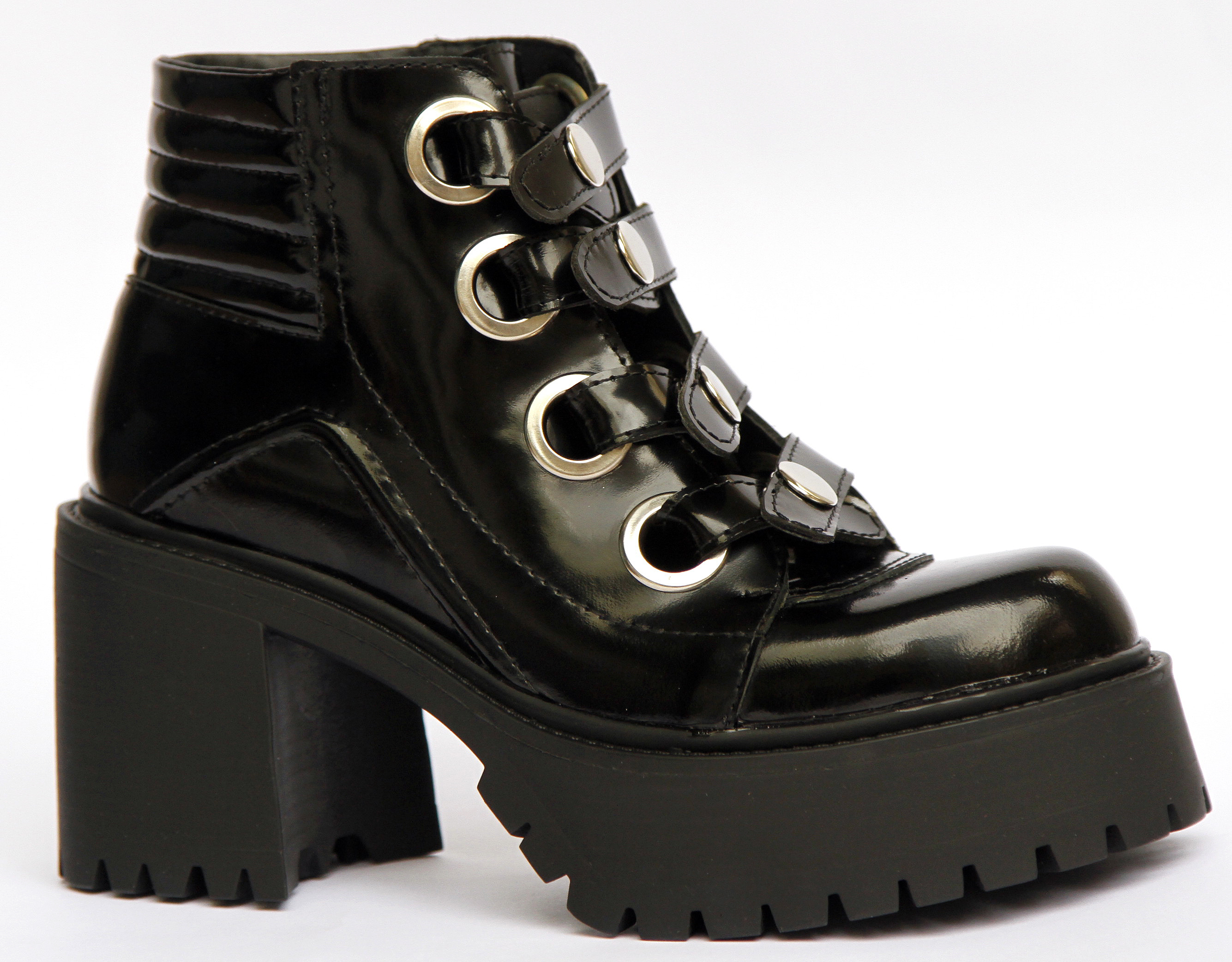 Borceguies de charol con suela tractor alta, talonera matelaseada, ojalillos y cintos con broches ($5.290, R.S).