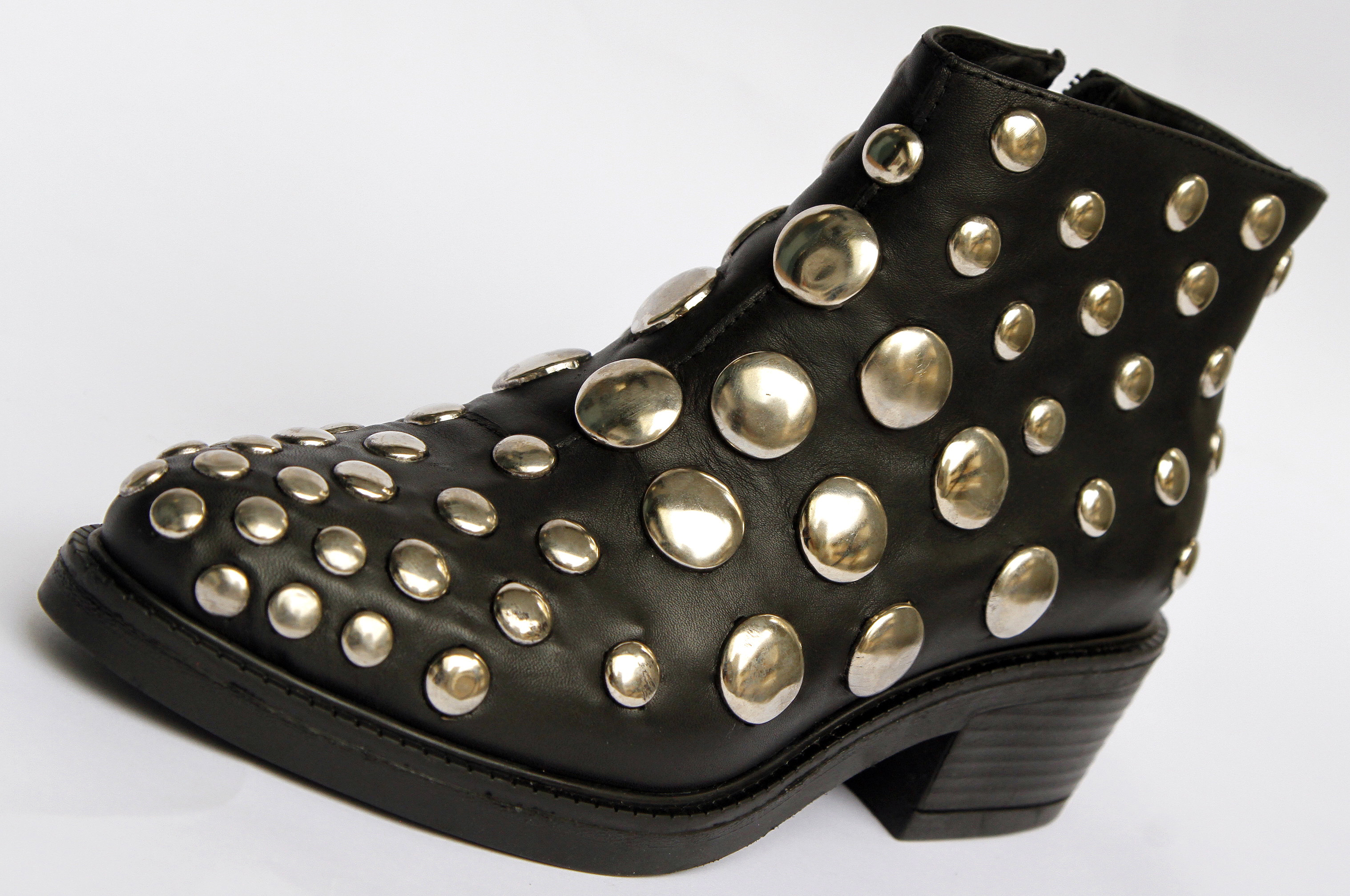Zapatos abotinado con elásticos laterales y tachas cuadradas y redondas de vidrio en el frente ($3.750, R.S).