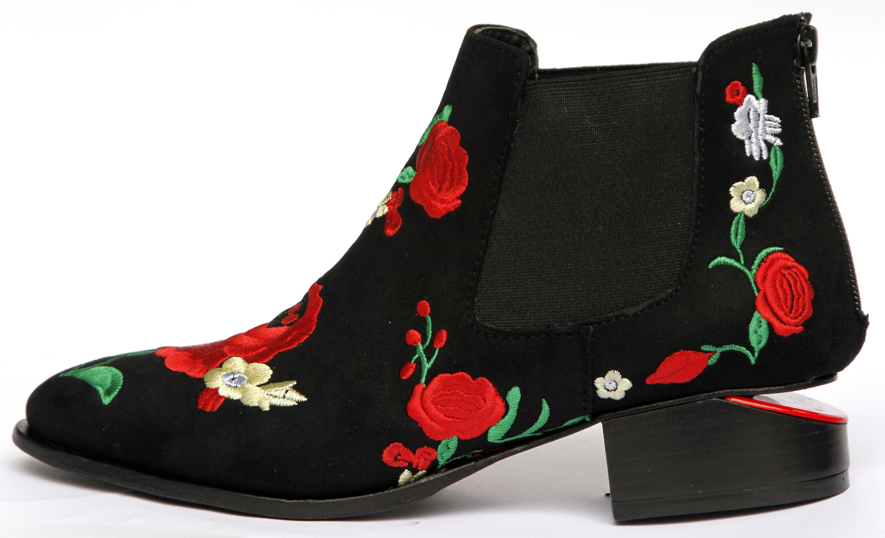 Botinetas de cuero rasado con elásticos latareles, cierre trasero y taco mordido. Está completamente bordada en flores de hilo de seda ($5.200, R.S).
