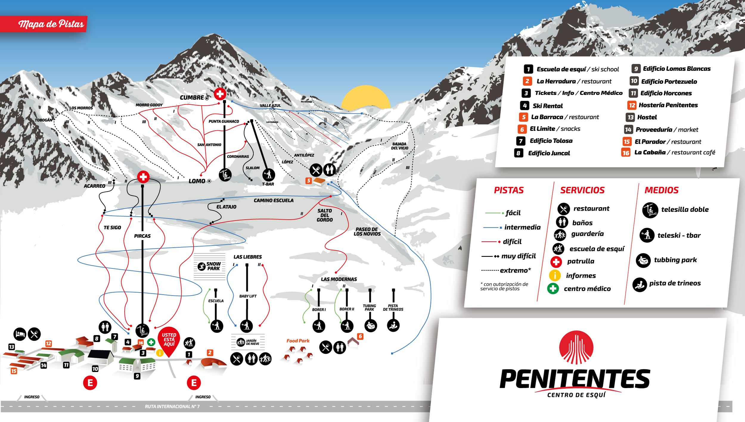 Otras de sus modernas prestaciones en sus 300 hectáreas esquiables son un área fuera de pista, un sector para snowboard freestyle, freeride y extremo, un parque de trineos, escuela de esquí, alquiler de equipos, tubbing-park con medio de elevación y una hostería dentro del complejo, donde funciona un restaurante. La longitud máxima de descenso ininterrumpido es de 7 mil metros y la distancia total del espacio esquiable alcanza 2,5 kilómetros. La mayor parte de la temporada, Los Penitentes ofrece nieve en polvo, seca y compacta.