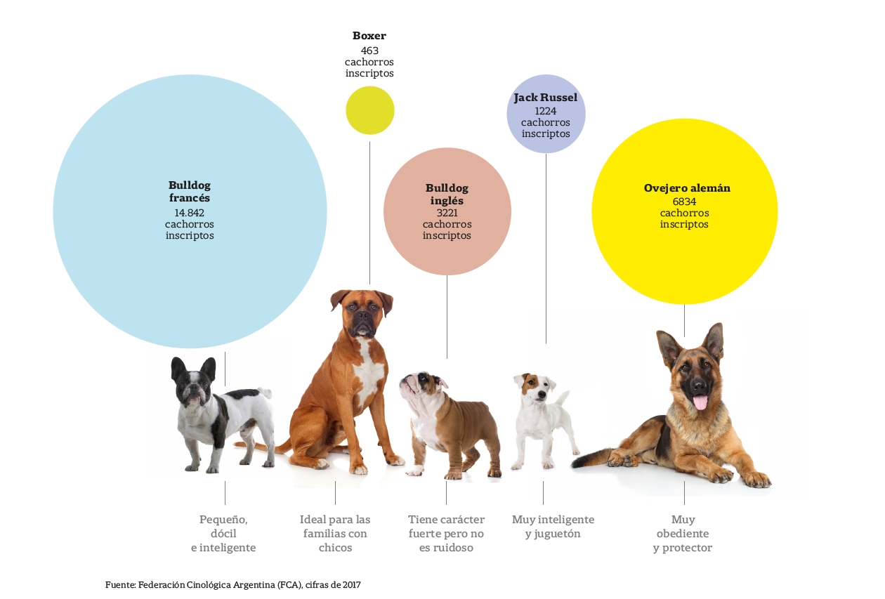 Pequeños, transportables e inteligentes, esas parecen ser las razones por las que el bulldog francés lidera el ranking de los perros de pedigrí más populares del país. Hernán Sánchez Correa, presidente de Subcomisión Nacional de Deportes Acuáticos, adiestrador habilitado e integrante del equipo de entrenamiento de la muestra Nuestros Perros, que se realizó el fin de semana pasado en La Rural, cuenta que según la Federación Cinológica Argentina son estos perritos franceses los más buscados por quienes desean un animal de raza.